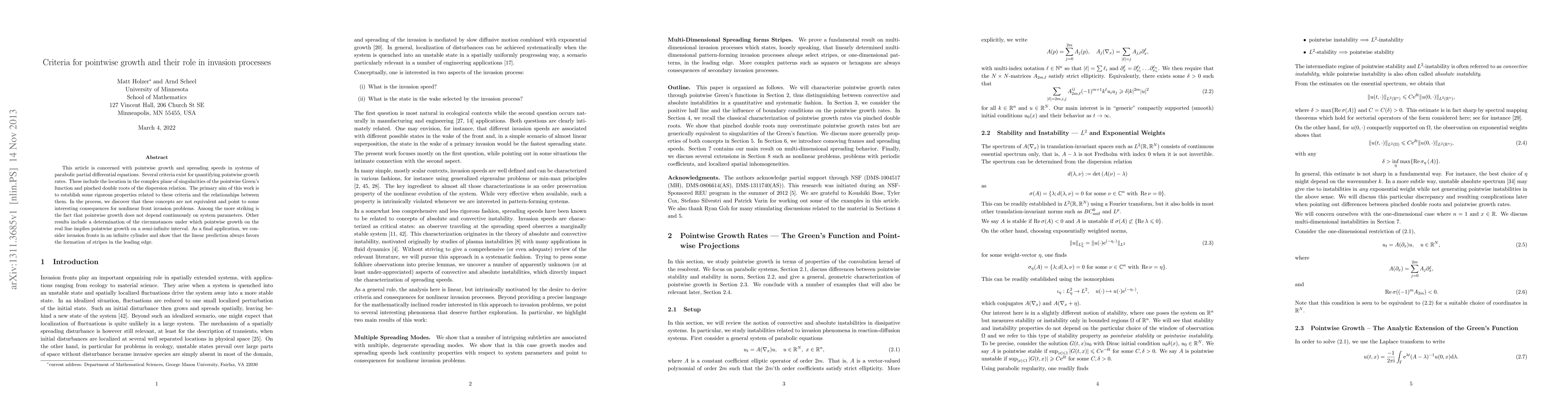 This article is concerned with pointwise growth and spreading speeds in systems of parabolic partial differential equations. Several criteria exist for quantifying pointwise growth rates. These include the location in the complex plane of singularities of the pointwise Green's function and pinched double roots of the dispersion relation. The primary aim of this work is to establish some rigorous properties related to these criteria and the relationships between them. In the process, we discover that these concepts are not equivalent and point to some interesting consequences for nonlinear front invasion problems. Among the more striking is the fact that pointwise growth does not depend continuously on system parameters. Other results include a determination of the circumstances under which pointwise growth on the real line implies pointwise growth on a semi-infinite interval. As a final application, we consider invasion fronts in an infinite cylinder and show that the linear prediction always favors the formation of stripes in the leading edge.