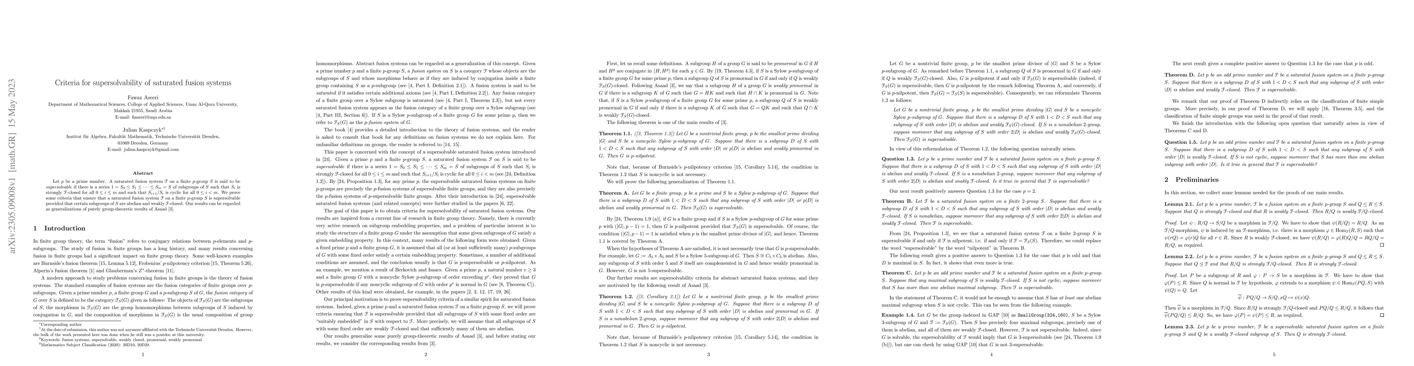The paper presents novel criteria and proofs for supersolvability of saturated fusion systems, generalizing earlier group-theoretic results.