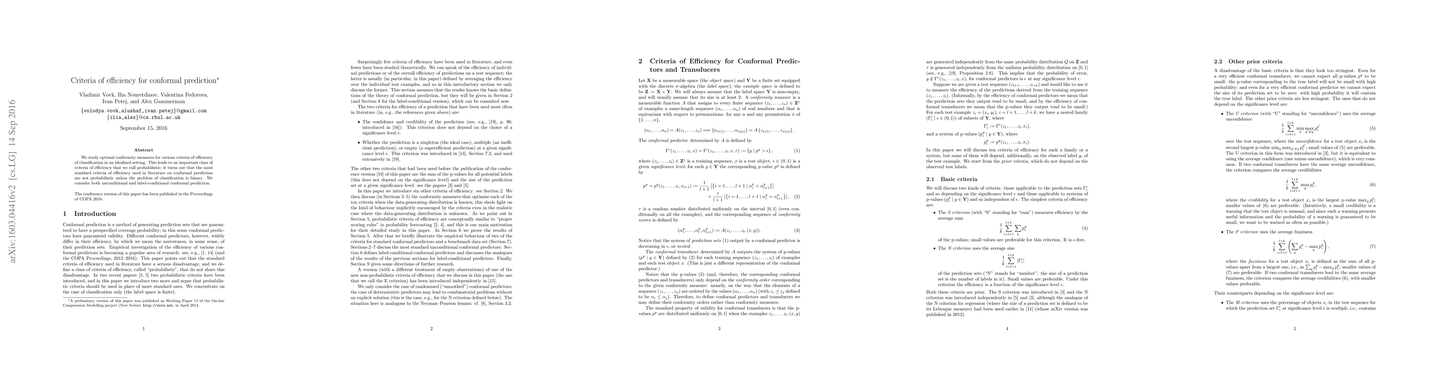 This paper investigates optimal conformity measures for classification efficiency criteria in an idealized setting, introducing a new class of probabilistic efficiency criteria. It reveals that standard efficiency criteria in conformal prediction are not probabilistic unless classification is binary.