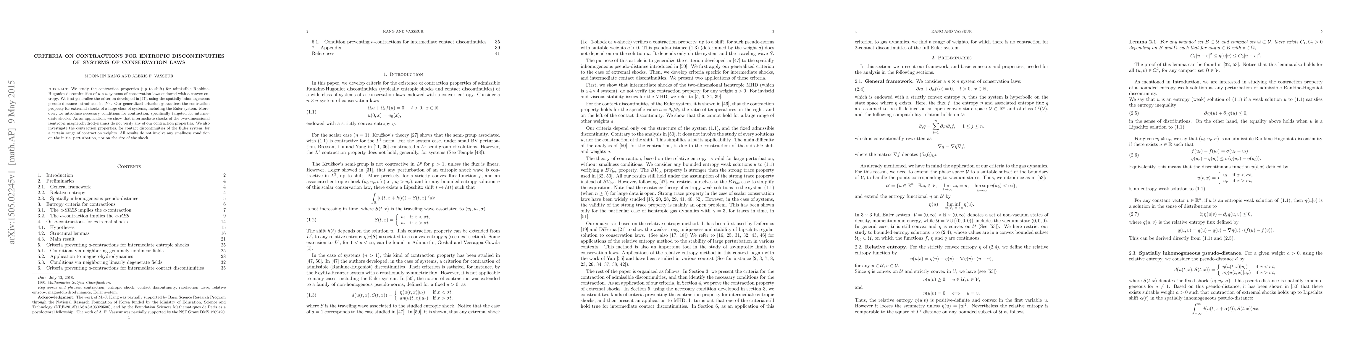 This paper generalizes criteria for contraction properties of admissible shocks in systems of conservation laws with convex entropy, ensuring contraction for extremal shocks in a broad class, including the Euler system. It also introduces necessary conditions for intermediate shocks and demonstrates that intermediate shocks in two-dimensional isentropic magnetohydrodynamics do not satisfy these criteria.