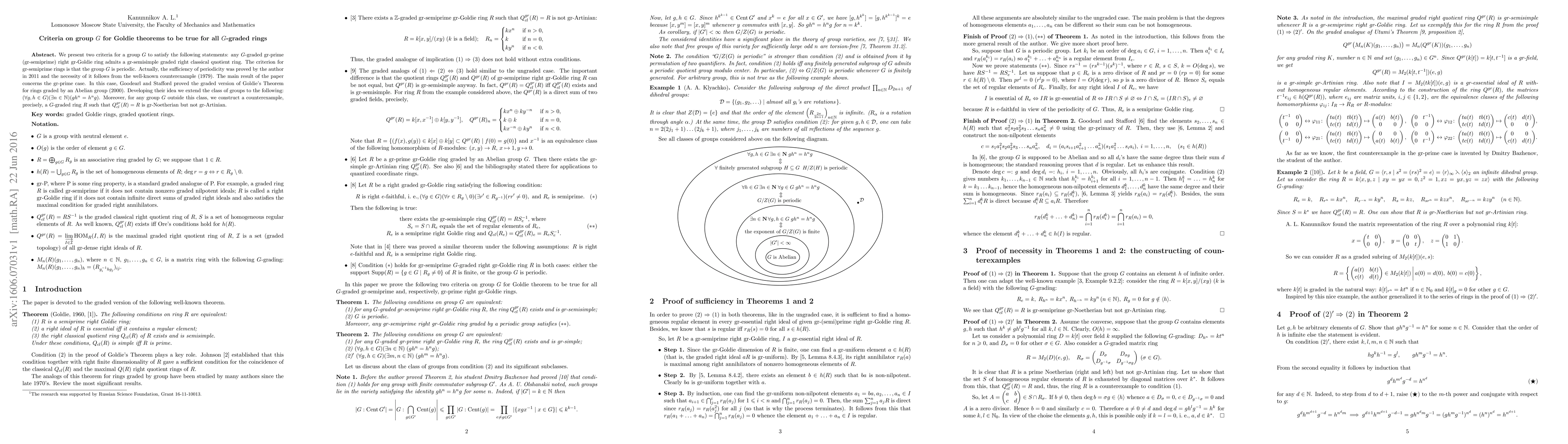 We present two criteria for a group $G$ to satisfy the following statements: any $G$-graded gr-prime (gr-semiprime) right gr-Goldie ring admits a gr-semisimple graded right classical quotient ring. The criterion for gr-semiprime rings is that the group $G$ is periodic. Actually, the sufficiency of periodicity was proved by the author in 2011 and the necessity of it follows from the well-known counterexample (1979). The main result of the paper concerns the gr-prime case. In this case, Goodearl and Stafford proved the graded version of Goldie's Theorem for rings graded by an Abelian group (2000). Developing their idea we extend the class of groups to the following: $(\forall g,h\in G)(\exists n\in \mathbb{N})(gh^n=h^ng)$. Moreover, for any group $G$ outside this class, we construct a counterexample, precisely, a~$G$-graded ring $R$ such that $Q^{gr}_{cl}(R)=R$ is gr-Noetherian but not gr-Artinian.