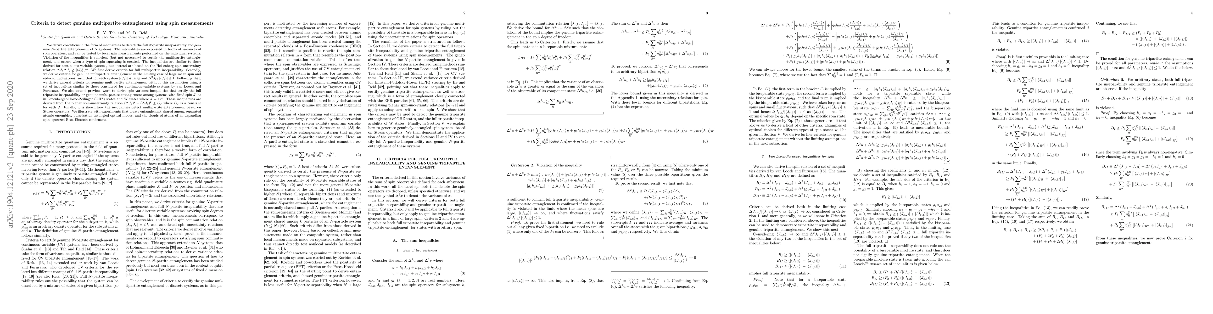 We derive conditions in the form of inequalities to detect the genuine $N$-partite entanglement of $N$ systems. The inequalities are expressed in terms of variances of spin operators, and can be tested by local spin measurements performed on the individual systems. Violation of the inequalities is sufficient (but not necessary) to certify the multipartite entanglement, and occurs when a type of spin squeezing is created. The inequalities are similar to those derived for continuous-variable systems, but instead are based on the Heisenberg spin-uncertainty relation $\Delta J_{x}\Delta J_{y}\geq|\langle J_{z}\rangle|/2$. We also extend previous work to derive spin-variance inequalities that certify the full tripartite inseparability or genuine multi-partite entanglement among systems with fixed spin $J$, as in Greenberger-Horne-Zeilinger (GHZ) states and W states where $J=1/2$. These inequalities are derived from the planar spin-uncertainty relation $(\Delta J_{x})^{2}+(\Delta J_{y})^{2}\geq C_{J}$ where $C_{J}$ is a constant for each $J$. Finally, it is shown how the inequalities detect multipartite entanglement based on Stokes operators. We illustrate with experiments that create entanglement shared among separated atomic ensembles, polarization-entangled optical modes, and the clouds of atoms of an expanding spin-squeezed Bose-Einstein condensate. For each example, we give a criterion to certify the mutual entanglement.