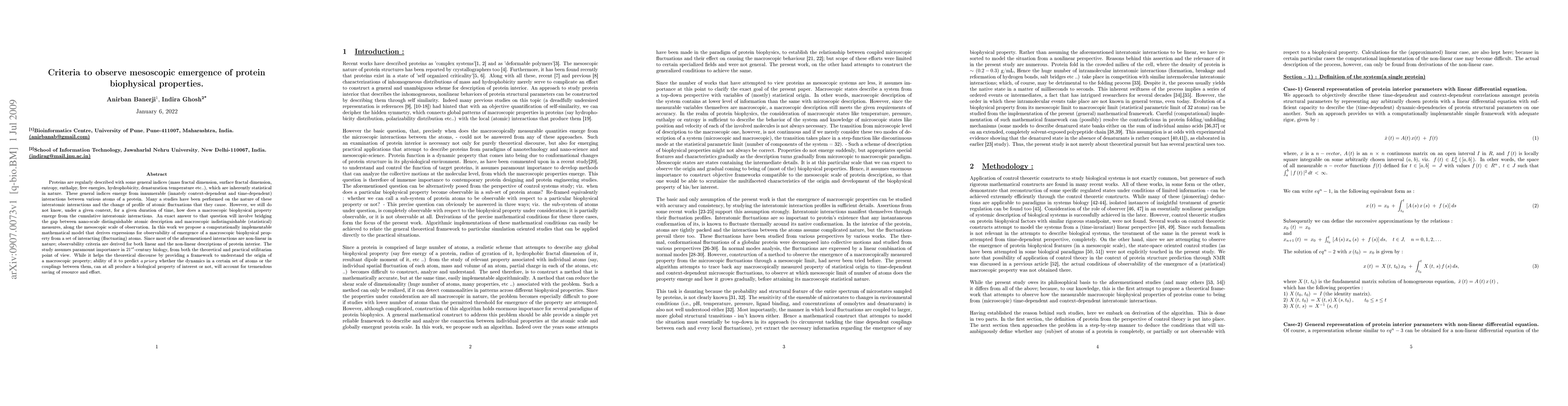 Proteins are regularly described with some general indices (mass fractal dimension, surface fractal dimension, entropy, enthalpy, free energies, hydrophobicity, denaturation temperature etc..), which are inherently statistical in nature. These general indices emerge from innumerable (innately context-dependent and time-dependent) interactions between various atoms of a protein. Many a studies have been performed on the nature of these inter-atomic interactions and the change of profile of atomic fluctuations that they cause. However, we still do not know, under a given context, for a given duration of time, how does a macroscopic biophysical property emerge from the cumulative inter-atomic interactions. An exact answer to that question will involve bridging the gap between nano-scale distinguishable atomic description and macroscopic indistinguishable (statistical) measures, along the mesoscopic scale of observation. In this work we propose a computationally implementable mathematical model that derives expressions for observability of emergence of a macroscopic biophysical property from a set of interacting (fluctuating) atoms. Since most of the aforementioned interactions are non-linear in nature; observability criteria are derived for both linear and the non-linear descriptions of protein interior. The study assumes paramount importance in 21st-century biology, from both the theoretical and practical utilitarian point of view.