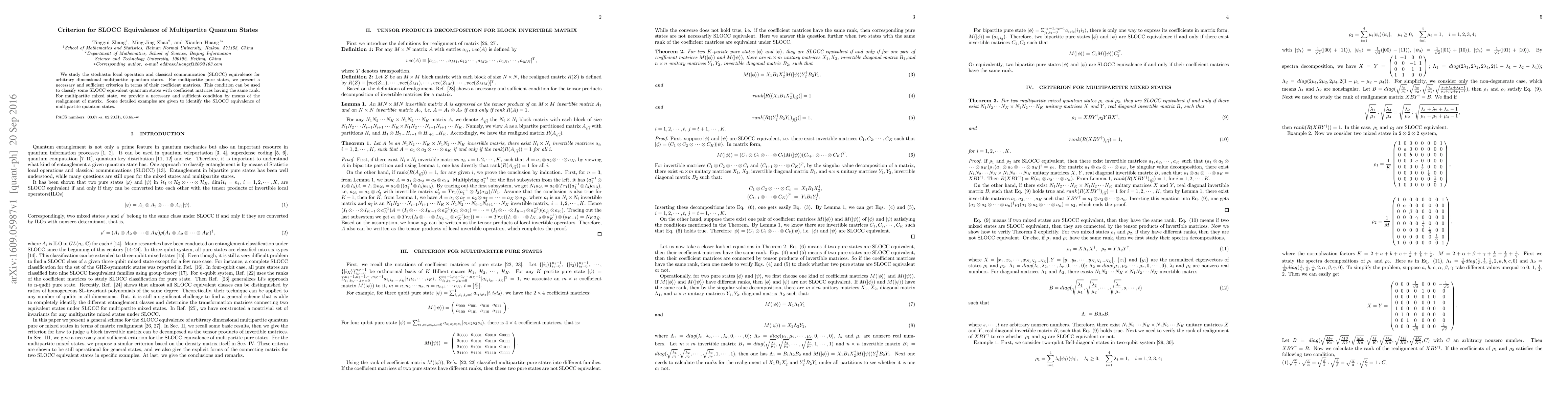 This paper presents criteria for SLOCC equivalence in multipartite quantum states, offering a necessary and sufficient condition for pure states based on coefficient matrices and a similar condition for mixed states using matrix realignment. Detailed examples illustrate the application of these criteria.