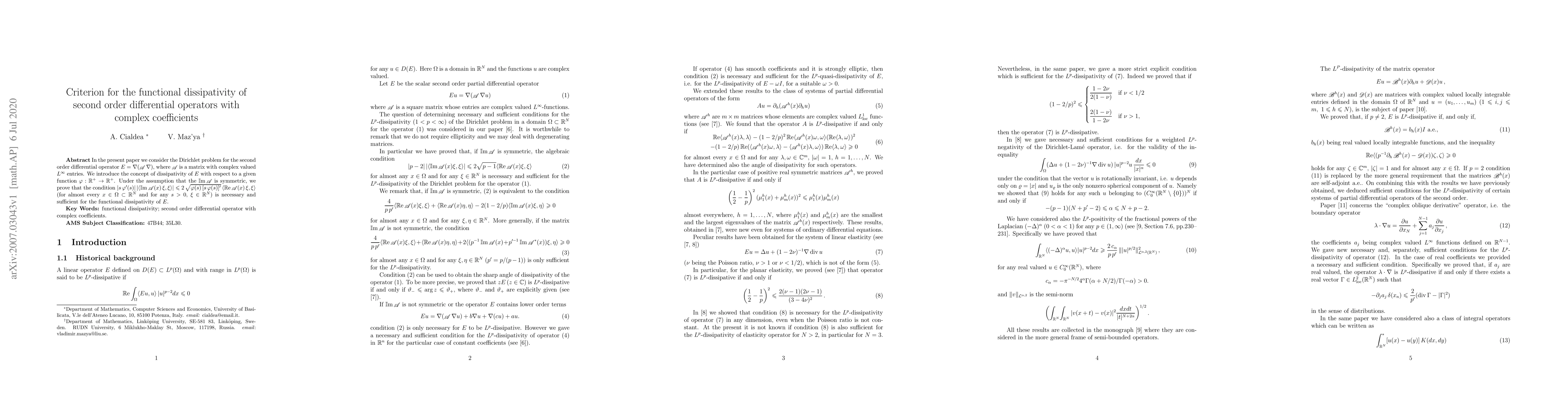 In the present paper we consider the Dirichlet problem for the second order differential operator $E=\nabla(A \nabla)$,where $A$ is a matrix with complex valued $L^\infty$ entries. We introduce the concept of dissipativity of $E$ with respect to a given function $\varphi:R^+ \to R^+$. Under the assumption that the $Im\, A$ is symmetric, we prove that the condition $|s\, \varphi'(s)| \, | \langle Im\, A (x)\, \xi,\xi\rangle |\leq 2\, \sqrt{\varphi(s)\, [s\, \varphi(s)]'}\, \langle Re\, A(x) \, \xi,\xi\rangle $ (for almost every $x\in\Omega\subset R^N$ and for any $s>0$, $\xi\in R^N$) is necessary and sufficient for the functional dissipativity of $E$.