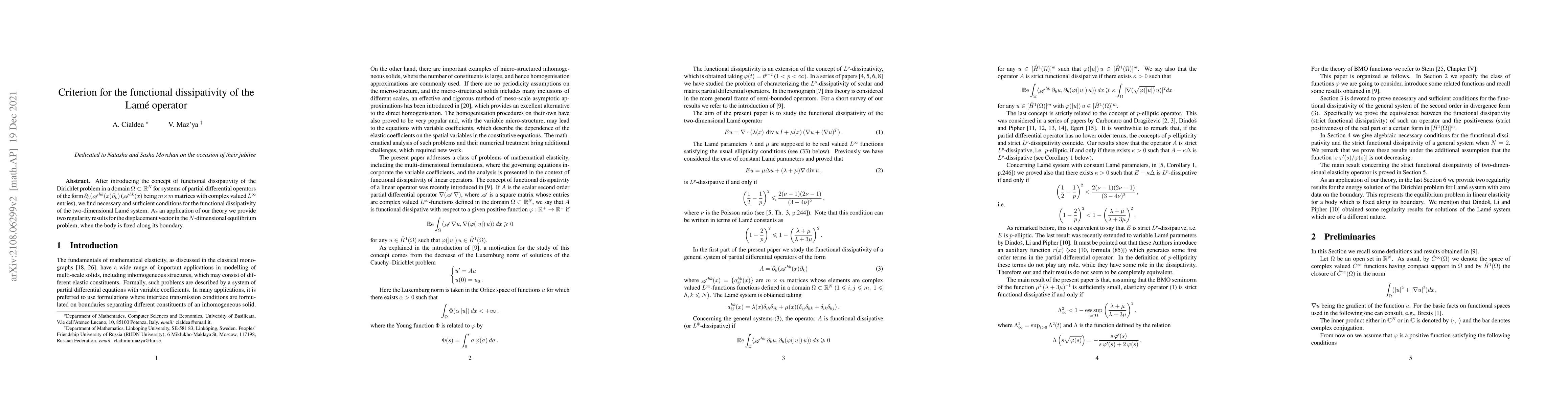 After introducing the concept of functional dissipativity of the Dirichlet problem in a domain $\Omega\subset {\mathbb R}^N$ for systems of partial differential operators of the form $\partial_{h}({\mathscr A}^{hk}(x)\partial_{k})$ (${\mathscr A}^{hk}(x)$ being $m \times m$ matrices with complex valued $L^\infty$ entries), we find necessary and sufficient conditions for the functional dissipativity of the two-dimensional Lam\'e system. As an application of our theory we provide two regularity results for the displacement vector in the $N$-dimensional equilibrium problem, when the body is fixed along its boundary.