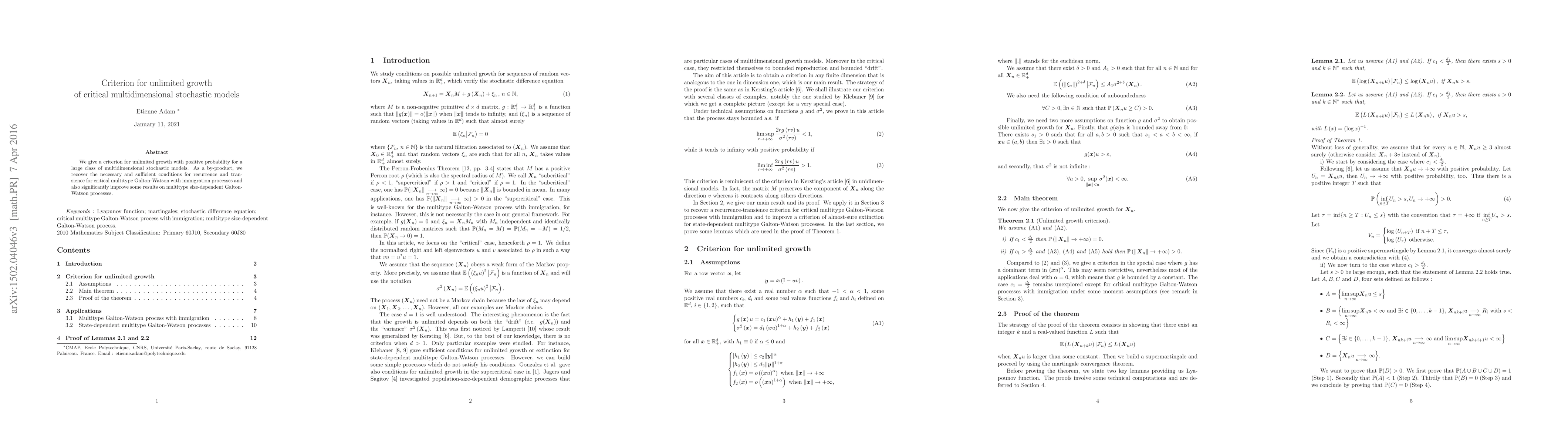 We give a criterion for unlimited growth with positive probability for a large class of multidimensional stochastic models. As a by-product, we recover the necessary and sufficient conditions for recurrence and transience for critical multitype Galton-Watson with immigration processes. We also significantly improve some results on multitype size-dependent Galton-Watson processes.