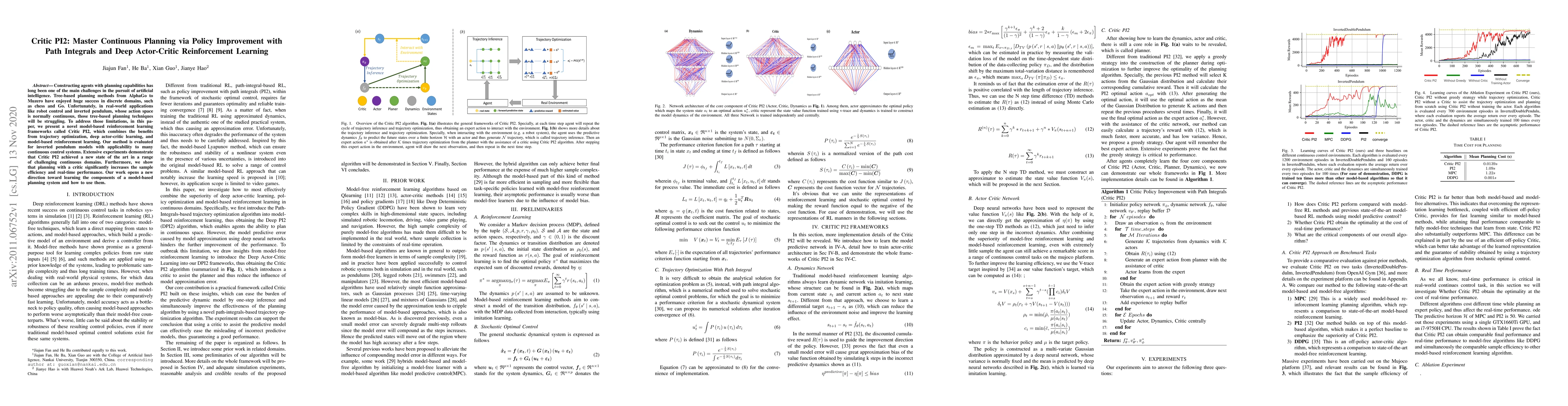 Constructing agents with planning capabilities has long been one of the main challenges in the pursuit of artificial intelligence. Tree-based planning methods from AlphaGo to Muzero have enjoyed huge success in discrete domains, such as chess and Go. Unfortunately, in real-world applications like robot control and inverted pendulum, whose action space is normally continuous, those tree-based planning techniques will be struggling. To address those limitations, in this paper, we present a novel model-based reinforcement learning frameworks called Critic PI2, which combines the benefits from trajectory optimization, deep actor-critic learning, and model-based reinforcement learning. Our method is evaluated for inverted pendulum models with applicability to many continuous control systems. Extensive experiments demonstrate that Critic PI2 achieved a new state of the art in a range of challenging continuous domains. Furthermore, we show that planning with a critic significantly increases the sample efficiency and real-time performance. Our work opens a new direction toward learning the components of a model-based planning system and how to use them.