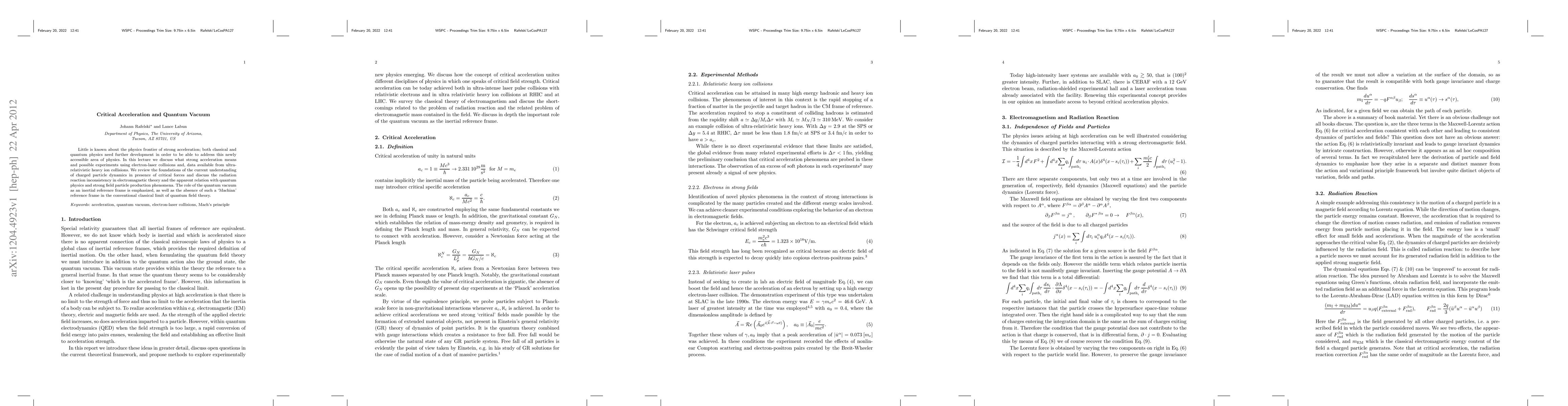 Little is known about the physics frontier of strong acceleration; both classical and quantum physics need further development in order to be able to address this newly accessible area of physics. In this lecture we discuss what strong acceleration means and possible experiments using electron-laser collisions and, data available from ultra-relativistic heavy ion collisions. We review the foundations of the current understanding of charged particle dynamics in presence of critical forces and discuss the radiation reaction inconsistency in electromagnetic theory and the apparent relation with quantum physics and strong field particle production phenomena. The role of the quantum vacuum as an inertial reference frame is emphasized, as well as the absence of such a `Machian' reference frame in the conventional classical limit of quantum field theory.