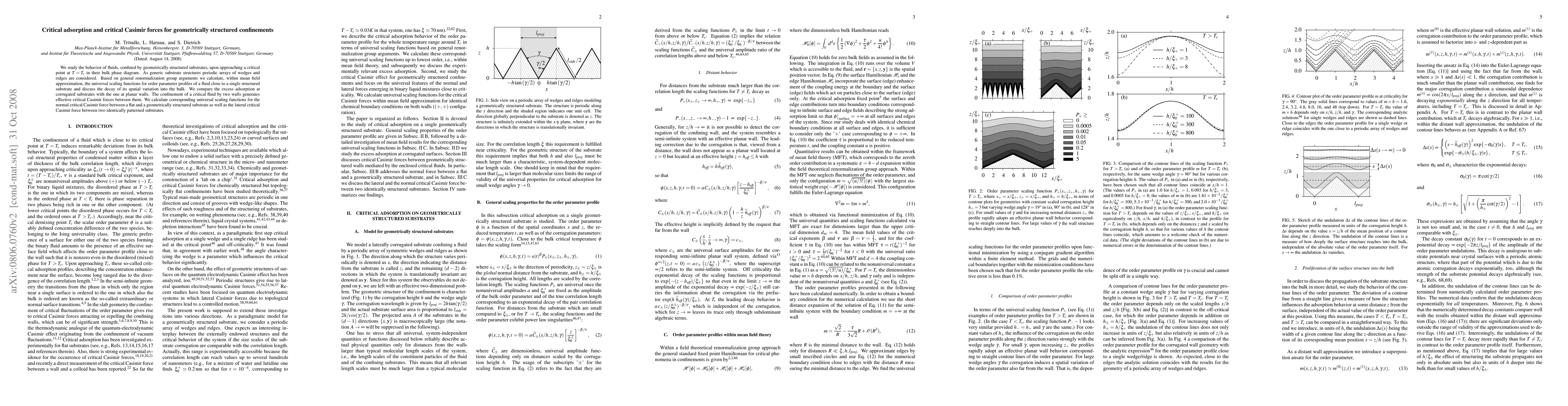 We study the behavior of fluids, confined by geometrically structured substrates, upon approaching a critical point at T = Tc in their bulk phase diagram. As generic substrate structures periodic arrays of wedges and ridges are considered. Based on general renormalization group arguments we calculate, within mean field approximation, the universal scaling functions for order parameter profiles of a fluid close to a single structured substrate and discuss the decay of its spatial variation into the bulk. We compare the excess adsorption at corrugated substrates with the one at planar walls. The confinement of a critical fluid by two walls generates effective critical Casimir forces between them. We calculate corresponding universal scaling functions for the normal critical Casimir force between a flat and a geometrically structured substrate as well as the lateral critical Casimir force between two identically patterned substrates.
