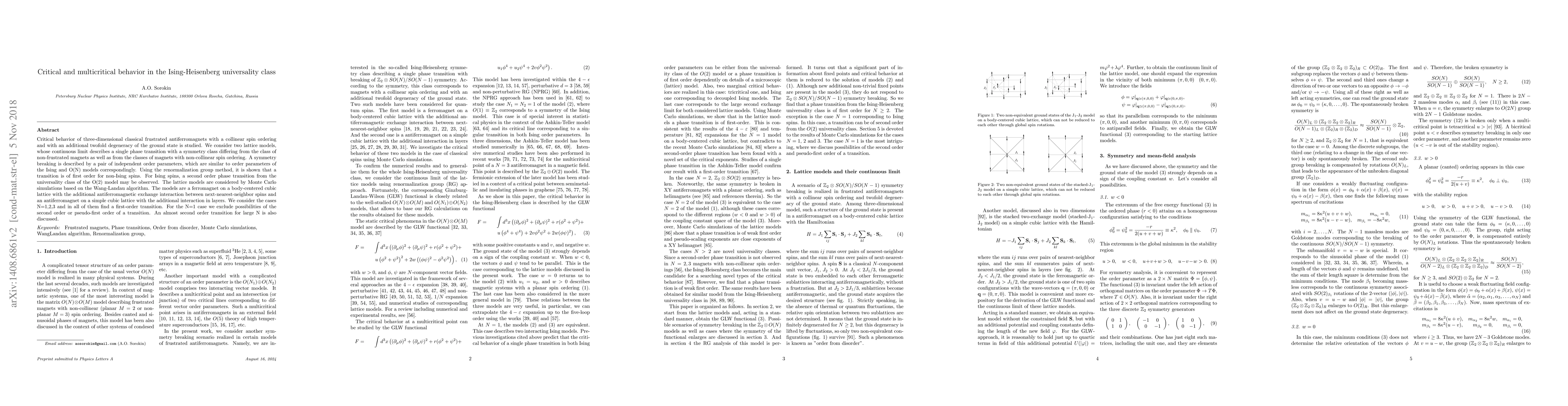 Critical behavior of three-dimensional classical frustrated antiferromagnets with a collinear spin ordering and with an additional twofold degeneracy of the ground state is studied. We consider two lattice models, whose continuous limit describes a single phase transition with a symmetry class differing from the class of non-frustrated magnets as well as from the classes of magnets with non-collinear spin ordering. A symmetry breaking is described by a pair of independent order parameters, which are similar to order parameters of the Ising and O(N) models correspondingly. Using the renormalization group method, it is shown that a transition is of first order for non-Ising spins. For Ising spins, a second order phase transition from the universality class of the O(2) model may be observed. The lattice models are considered by Monte Carlo simulations based on the Wang-Landau algorithm. The models are a ferromagnet on a body-centered cubic lattice with the additional antiferromagnetic exchange interaction between next-nearest-neighbor spins and an antiferromagnet on a simple cubic lattice with the additional interaction in layers. We consider the cases N=1,2,3 and in all of them find a first-order transition. For the N=1 case we exclude possibilities of the second order or pseudo-first order of a transition. An almost second order transition for large N is also discussed.