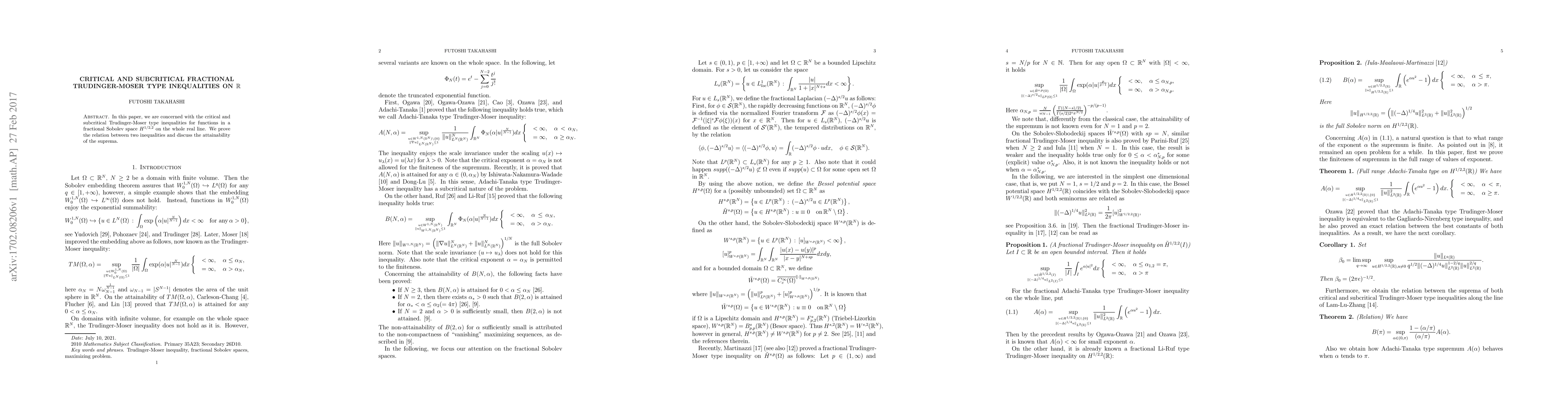 In this paper, we are concerned with the critical and subcritical Trudinger-Moser type inequalities for functions in a fractional Sobolev space $H^{1/2,2}$ on the whole real line. We prove the relation between two inequalities and discuss the attainability of the suprema.