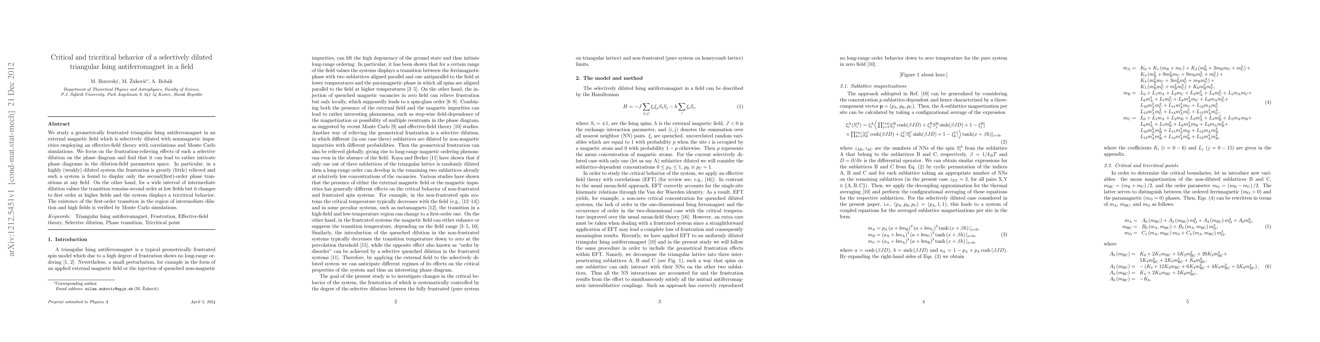 This paper investigates the critical and tricritical behavior of a selectively diluted triangular Ising antiferromagnet under an external magnetic field, revealing complex phase diagrams influenced by dilution levels. The study finds that high dilution relieves frustration leading to second-order transitions, while intermediate dilution causes a transition from second to first-order with tricritical behavior verified by simulations.