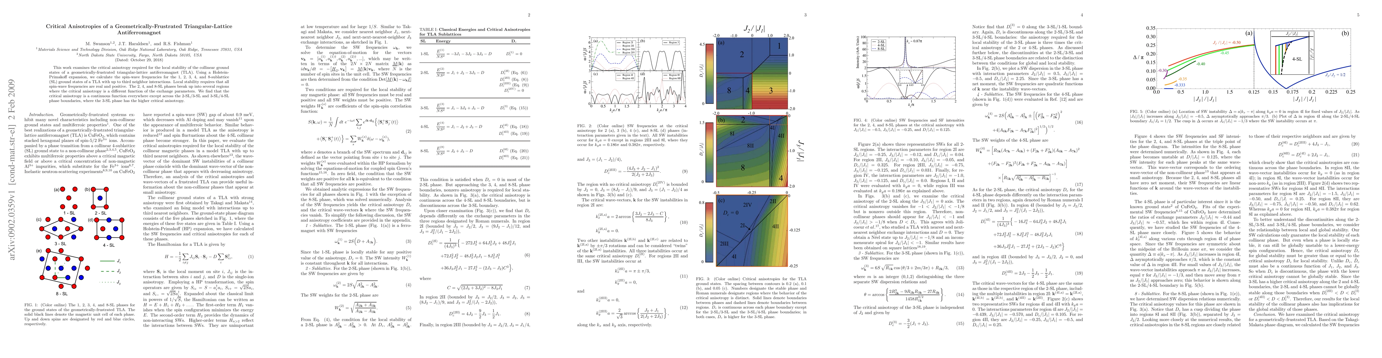 This study investigates the critical anisotropy needed for stability in various ground states of a geometrically-frustrated triangular-lattice antiferromagnet. Using spin-wave calculations, it reveals that the 2, 4, and 8-sublattice phases transition into regions with varying critical anisotropies, except at the 2-SL/3-SL and 3-SL/4-SL boundaries where the 3-SL phase exhibits higher critical anisotropy.