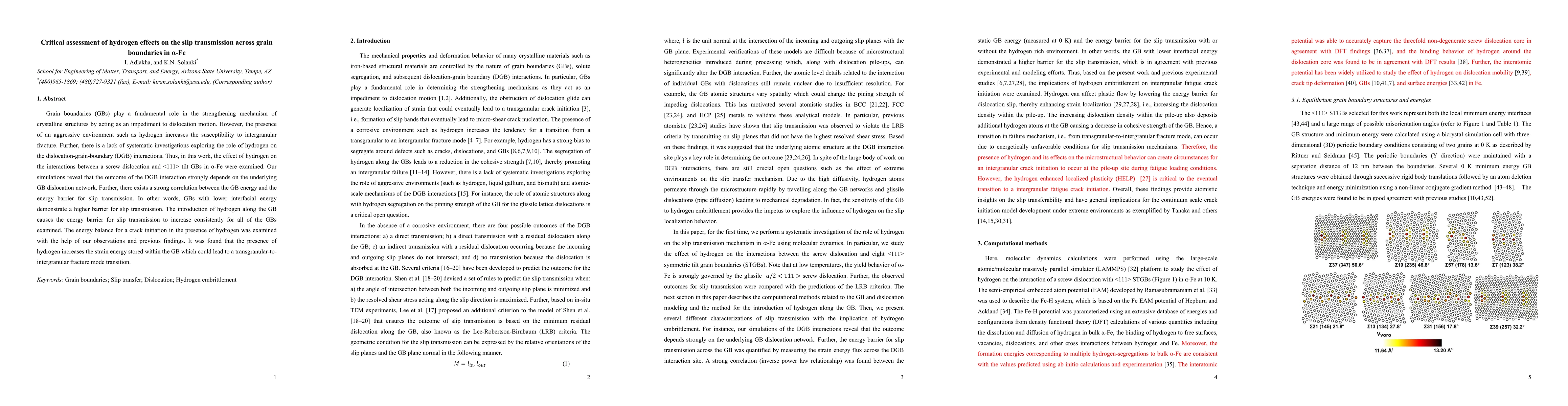 This study investigates the impact of hydrogen on dislocation-grain boundary interactions in α-Fe, revealing that hydrogen increases the energy barrier for slip transmission across grain boundaries. The presence of hydrogen elevates the strain energy stored within grain boundaries, potentially causing a transition from transgranular to intergranular fracture modes.