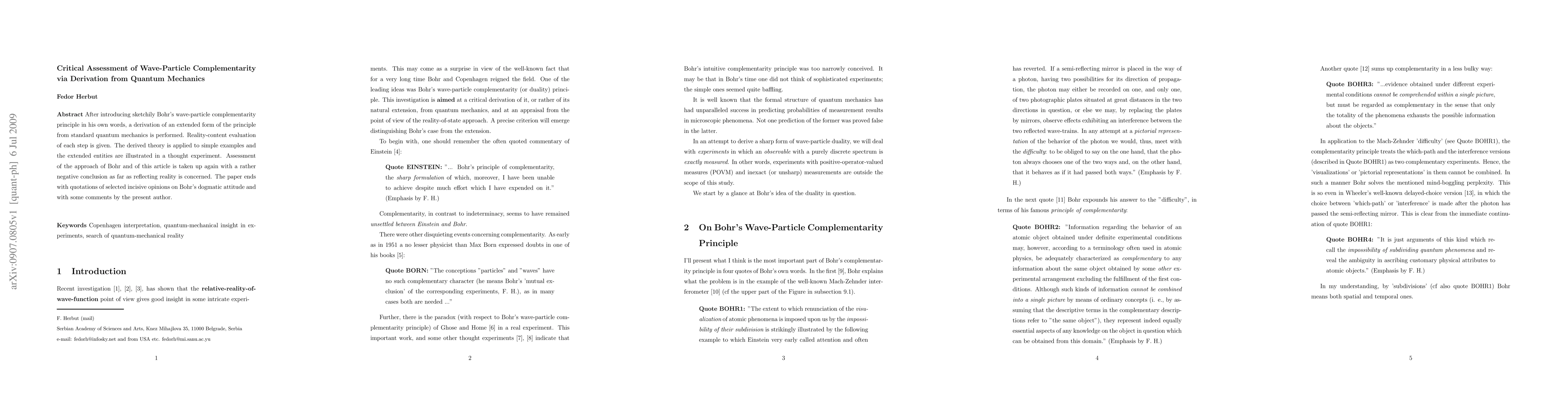 This paper derives an extended version of Bohr's wave-particle complementarity principle from standard quantum mechanics, evaluates each step for reality, and applies it to simple examples. The author concludes that neither Bohr's nor the derived approach adequately reflects reality, critiquing Bohr's dogmatic stance.