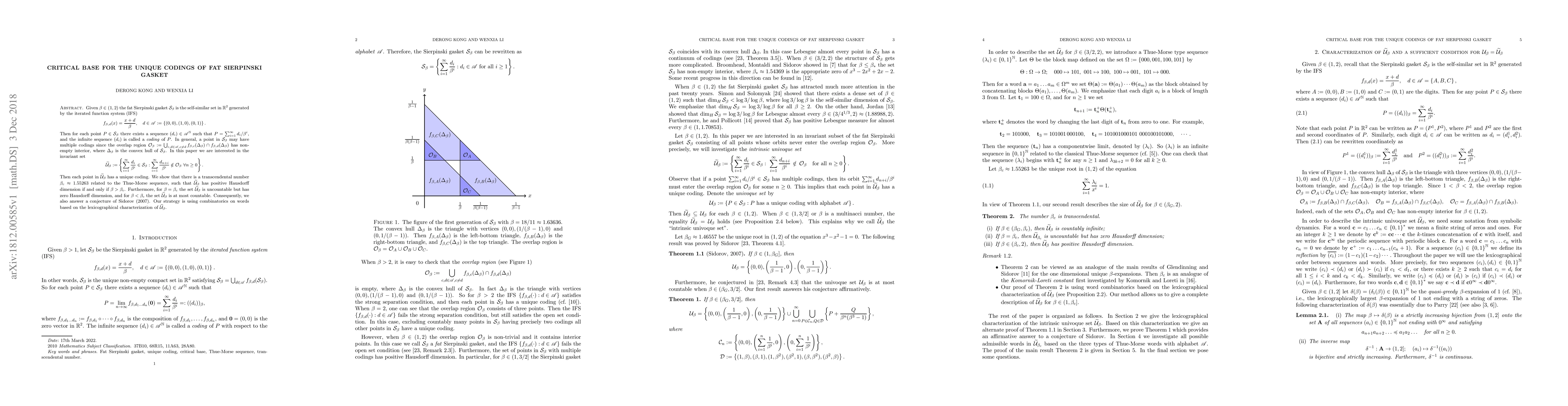 Given $\beta\in(1,2)$ the fat Sierpinski gasket $\mathcal S_\beta$ is the self-similar set in $\mathbb R^2$ generated by the iterated function system (IFS) \[ f_{\beta,d}(x)=\frac{x+d}{\beta},\quad d\in\mathcal A:=\{(0, 0), (1,0), (0,1)\}. \] Then for each point $P\in\mathcal S_\beta$ there exists a sequence $(d_i)\in\mathcal A^\mathbb N$ such that $P=\sum_{i=1}^\infty d_i/\beta^i$, and the infinite sequence $(d_i)$ is called a \emph{coding} of $P$. In general, a point in $\mathcal S_\beta$ may have multiple codings since the overlap region $\mathcal O_\beta:=\bigcup_{c,d\in\mathcal A, c\ne d}f_{\beta,c}(\Delta_\beta)\cap f_{\beta,d}(\Delta_\beta)$ has non-empty interior, where $\Delta_\beta$ is the convex hull of $\mathcal S_\beta$. In this paper we are interested in the invariant set \[ \widetilde{\mathcal U}_\beta:=\left\{\sum_{i=1}^\infty \frac{d_i}{\beta^i}\in \mathcal S_\beta: \sum_{i=1}^\infty\frac{d_{n+i}}{\beta^i}\notin\mathcal O_\beta~\forall n\ge 0\right\}. \] Then each point in $ \widetilde{\mathcal U}_\beta$ has a unique coding. We show that there is a transcendental number $\beta_c\approx 1.55263$ related to the Thue-Morse sequence, such that $\widetilde{\mathcal U}_\beta$ has positive Hausdorff dimension if and only if $\beta>\beta_{c}$. Furthermore, for $\beta=\beta_c$ the set $\widetilde{\mathcal U}_\beta$ is uncountable but has zero Hausdorff dimension, and for $\beta<\beta_c$ the set $\widetilde{\mathcal U}_\beta$ is at most countable. Consequently, we also answer a conjecture of Sidorov (2007). Our strategy is using combinatorics on words based on the lexicographical characterization of $\widetilde{\mathcal U}_\beta$.