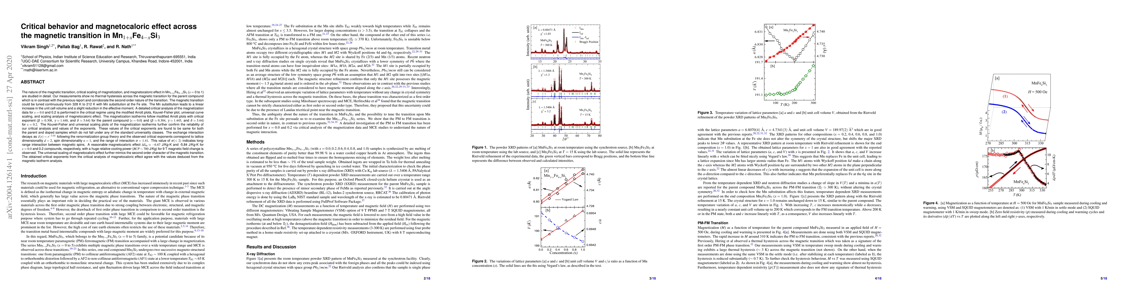 This paper investigates the magnetic transition, critical scaling, and magnetocaloric effect in Mn$_{1+x}$Fe$_{4-x}$Si$_{3}$ compounds. The study reveals a second-order magnetic transition with no thermal hysteresis, and continuous tuning via Mn substitution. Critical exponents derived from magnetization isotherms and magnetocaloric effect analysis confirm the second-order nature of the transition, with a significant magnetocaloric effect observed.