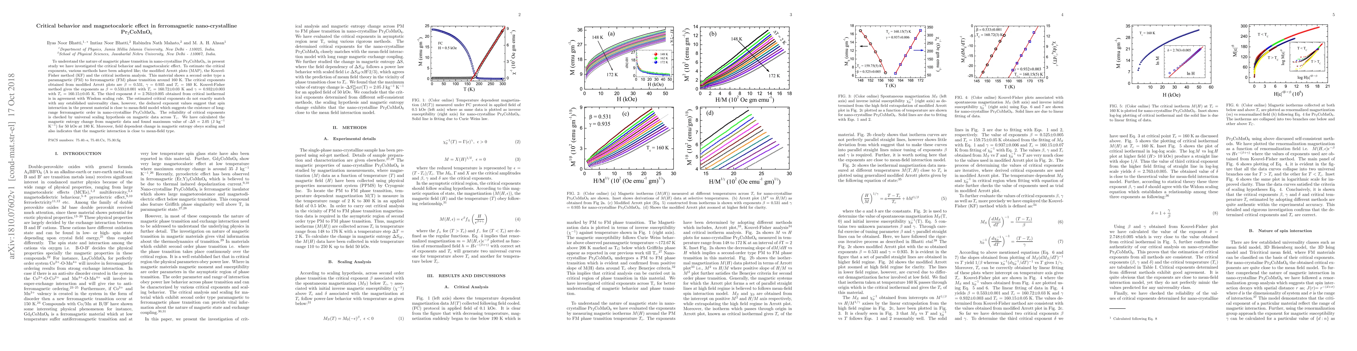 To understand the nature of magnetic phase transition in nano-crystalline Pr$_2$CoMnO$_6$, in present study we have investigated the critical behavior and magnetocaloric effect. To estimate the critical exponents, various methods have been adopted like; the modified Arrott plots (MAP), the Kouvel-Fisher method (KF) and the critical isotherm analysis. This material shows a second order type a paramagnetic (PM) to ferromagnetic (FM) phase transition around 160 K. The critical exponents obtained from modified Arrott plots are $\beta$ = 0.531, $\gamma$ = 0.935 and $T_c$ = 160 K. Kouvel-Fisher method gives the exponents as $\beta$ = 0.533$\pm$0.001 with $T_c$ = 160.72$\pm$0.03 K and $\gamma$ = 0.932$\pm$0.003 with $T_c$ = 160.15$\pm$0.05 K. The third exponent $\delta$ = 2.763$\pm$0.005 obtained from critical isothermal is in agreement with Wisdom scaling rule. The estimated critical exponents do not exactly match with any established universality class, however, the deduced exponent values suggest that spin interaction in the present material is close to mean-field model which suggests the existence of long-range ferromagnetic order in nano-crystalline Pr$_2$CoMnO$_6$. The reliability of critical exponents is checked by universal scaling hypothesis on magnetic data across T$_c$. We have calculated the magnetic entropy change from magnetic data and found maximum value of -$\Delta$S = 2.05 (J kg$^{-1}$ K$^{-1}$) for 50 kOe at 180 K. Moreover, field dependent change in magnetic entropy obeys scaling and also indicates that the magnetic interaction is close to mean-field type.