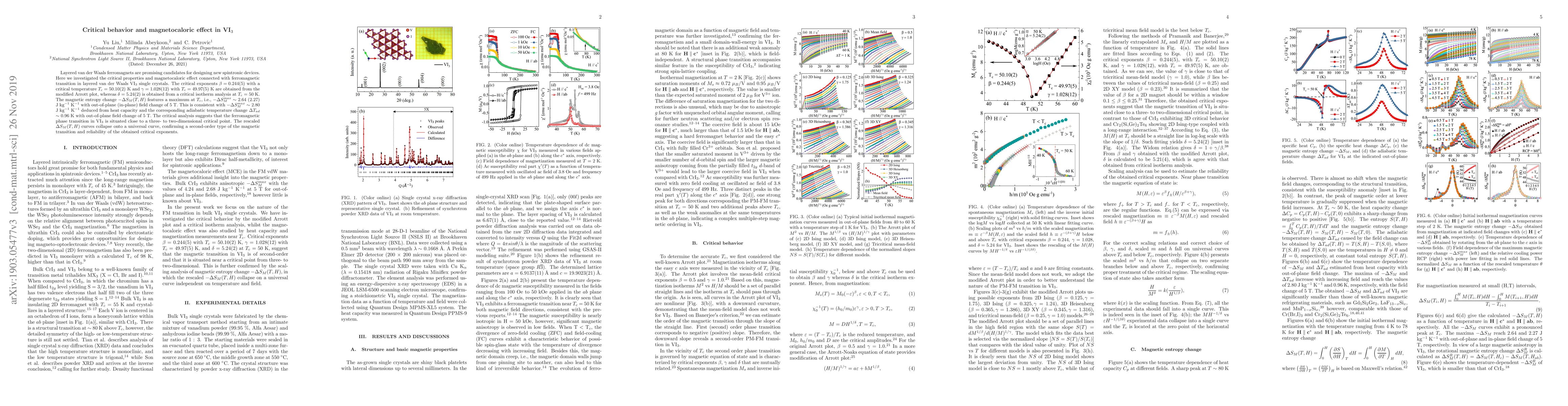 This study investigates the critical behavior and magnetocaloric effect in VI$_3$ single crystals, revealing critical exponents and a magnetic entropy change peak at the ferromagnetic transition temperature. The findings suggest a second-order magnetic transition near a three- to two-dimensional critical point.