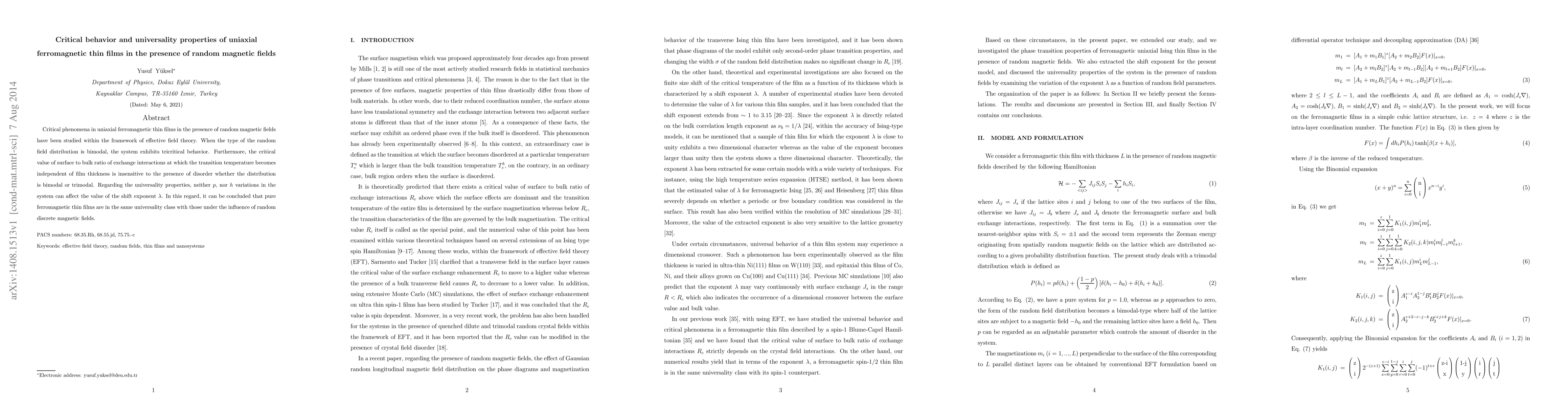 Critical phenomena in uniaxial ferromagnetic thin films in the presence of random magnetic fields have been studied within the framework of effective field theory. When the type of the random field distribution is bimodal, the system exhibits tricritical behavior. Furthermore, the critical value of surface to bulk ratio of exchange interactions at which the transition temperature becomes independent of film thickness is insensitive to the presence of disorder whether the distribution is bimodal or trimodal. Regarding the universality properties, neither $p$, nor $h$ variations in the system can affect the value of the shift exponent $\lambda$. In this regard, it can be concluded that pure ferromagnetic thin films are in the same universality class with those under the influence of random discrete magnetic fields.