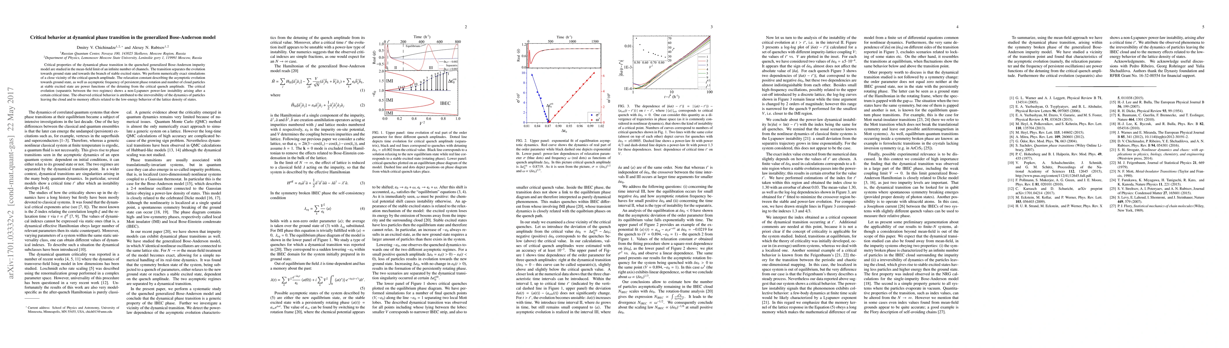 Critical properties of the dynamical phase transition in the quenched generalized Bose-Anderson impurity model are studied in the mean-field limit of an infinite number of channels. The transition separates the evolution toward ground state and toward the branch of stable excited states. We perform numerically exact simulations of a close vicinity of the critical quench amplitude. The relaxation constant describing the asymptotic evolution toward ground state, as well as asymptotic frequency of persistent phase rotation and number of cloud particles at stable excited state are power functions of the detuning from the critical quench amplitude. The critical evolution (separatrix between the two regimes) shows a non-Lyapunov power-law instability arising after a certain critical time. The observed critical behavior is attributed to the irreversibility of the dynamics of particles leaving the cloud and to memory effects related to the low-energy behavior of the lattice density of states.