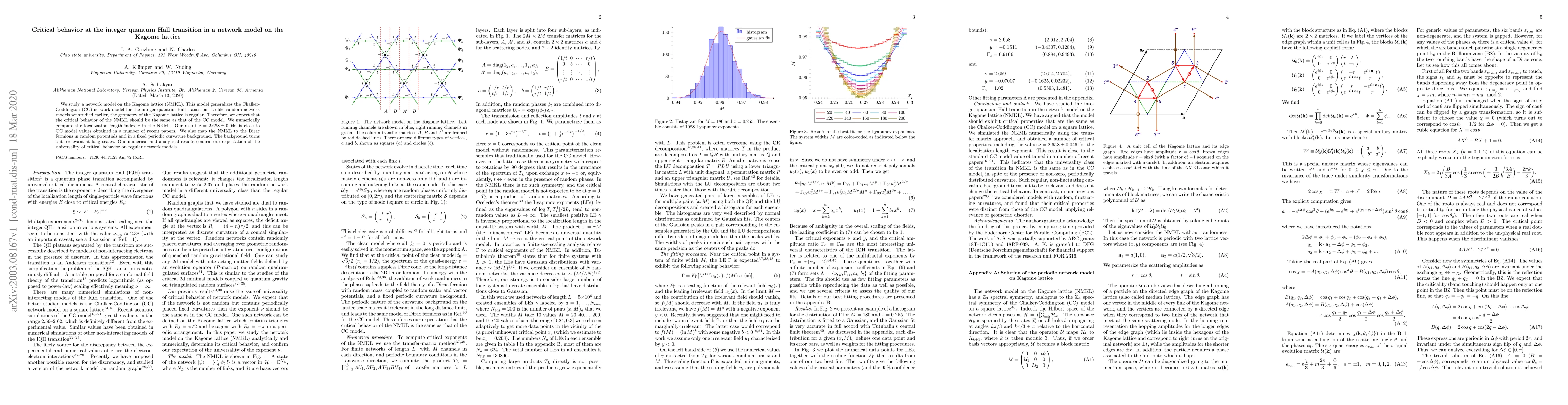 We study a network model on the Kagome lattice (NMKL). This model generalizes the Chalker-Coddington (CC) network model for the integer quantum Hall transition. Unlike random network models we studied earlier, the geometry of the Kagome lattice is regular. Therefore, we expect that the critical behavior of the NMKL should be the same as that of the CC model. We numerically compute the localization length index $\nu$ in the NKML. Our result $\nu= 2.658 \pm 0.046$ is close to CC model values obtained in a number of recent papers. We also map the NMKL to the Dirac fermions in random potentials and in a fixed periodic curvature background. The background turns out irrelevant at long scales. Our numerical and analytical results confirm our expectation of the universality of critical behavior on regular network models.