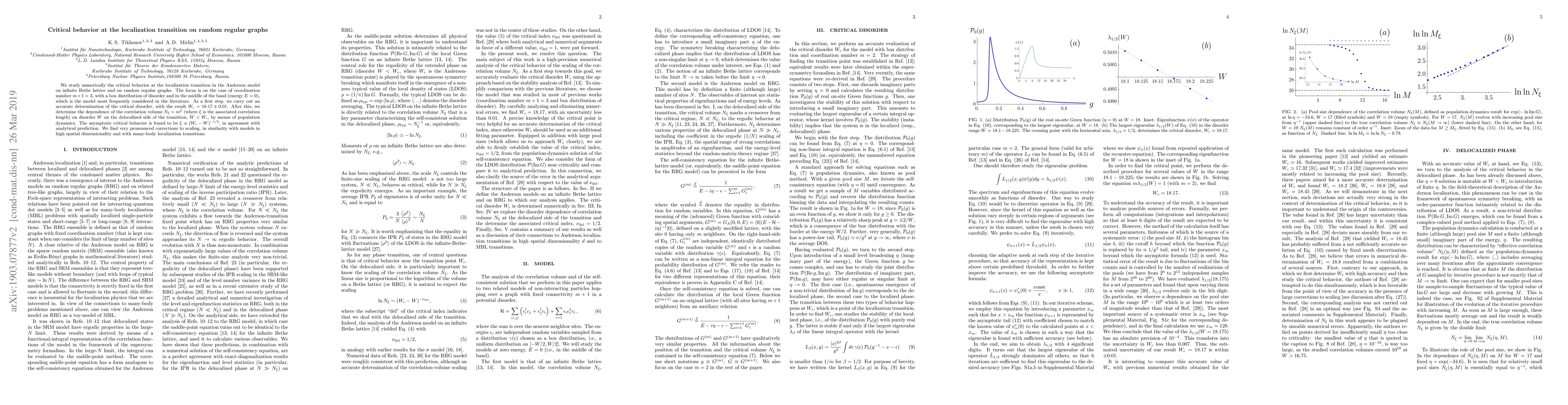 This paper numerically investigates the critical behavior at the localization transition in the Anderson model on random regular graphs, specifically for coordination number $m+1 = 3$. The study determines the critical disorder $W_c = 18.17 \pm 0.01$ and finds that the correlation length $\xi$ scales as $(W_c-W)^{-1/2}$ near the transition, with significant corrections to scaling.