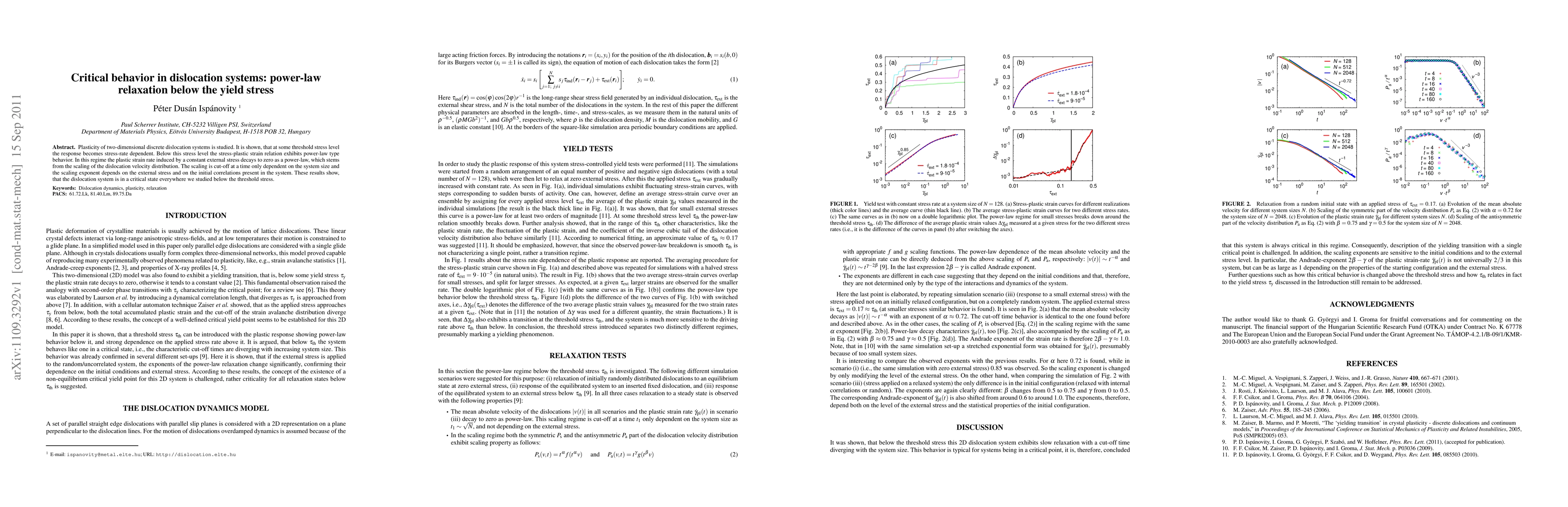 This paper investigates the plasticity in two-dimensional discrete dislocation systems, revealing that below a threshold stress, the stress-plastic strain relation follows a power-law. The plastic strain rate decreases as a power-law under constant stress, indicating a critical state in the dislocation system.