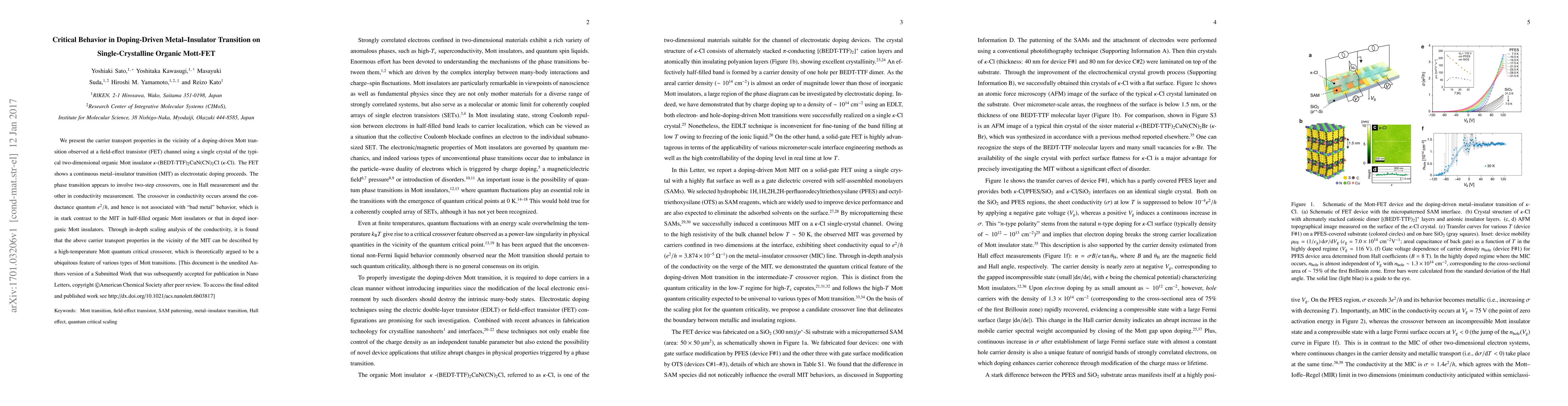 This study investigates the doping-driven metal-insulator transition in a single-crystalline organic Mott insulator using a field-effect transistor. The transition is characterized by two-step crossovers in Hall and conductivity measurements, which align with a high-temperature Mott quantum critical crossover, differing from other organic and inorganic Mott transitions.