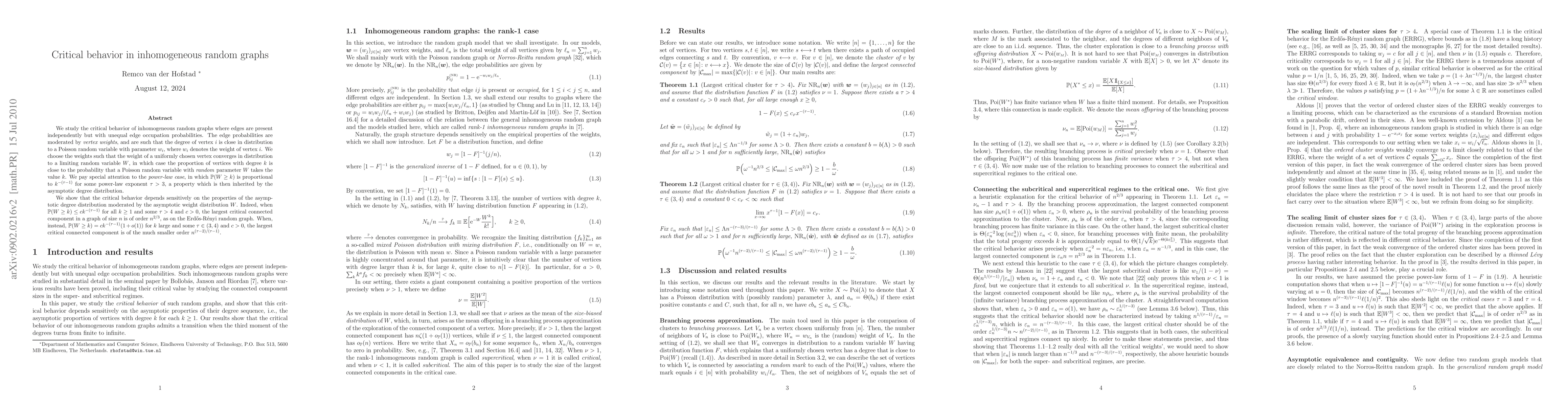 We study the critical behavior of inhomogeneous random graphs where edges are present independently but with unequal edge occupation probabilities. The edge probabilities are moderated by vertex weights, and are such that the degree of vertex i is close in distribution to a Poisson random variable with parameter w_i, where w_i denotes the weight of vertex i. We choose the weights such that the weight of a uniformly chosen vertex converges in distribution to a limiting random variable W, in which case the proportion of vertices with degree k is close to the probability that a Poisson random variable with random parameter W takes the value k. We pay special attention to the power-law case, in which P(W\geq k) is proportional to k^{-(\tau-1)} for some power-law exponent \tau>3, a property which is then inherited by the asymptotic degree distribution. We show that the critical behavior depends sensitively on the properties of the asymptotic degree distribution moderated by the asymptotic weight distribution W. Indeed, when P(W\geq k) \leq ck^{-(\tau-1)} for all k\geq 1 and some \tau>4 and c>0, the largest critical connected component in a graph of size n is of order n^{2/3}, as on the Erd\H{o}s-R\'enyi random graph. When, instead, P(W\geq k)=ck^{-(\tau-1)}(1+o(1)) for k large and some \tau\in (3,4) and c>0, the largest critical connected component is of the much smaller order n^{(\tau-2)/(\tau-1)}.