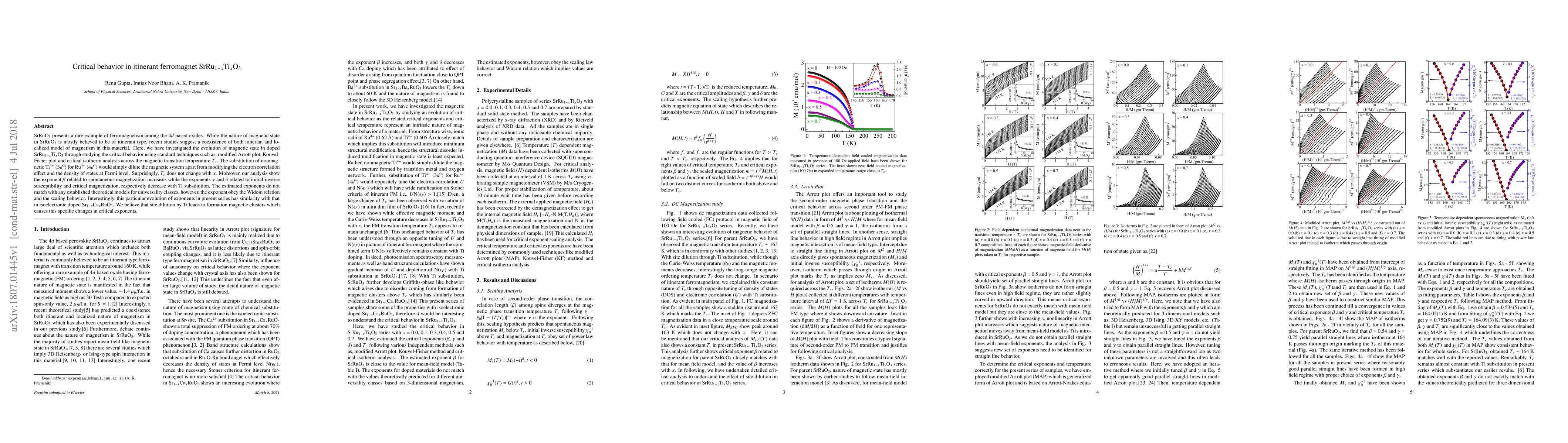 This study investigates the magnetic behavior in doped SrRu$_{1-x}$Ti$_x$O$_3$, revealing that despite Ti substitution, the critical temperature $T_c$ remains unchanged. The critical exponents $\beta$, $\gamma$, and $\delta$ show non-standard variations, suggesting the formation of magnetic clusters due to site dilution, which aligns with similar trends observed in isoelectronic Sr$_{1-x}$Ca$_x$RuO$_3$.