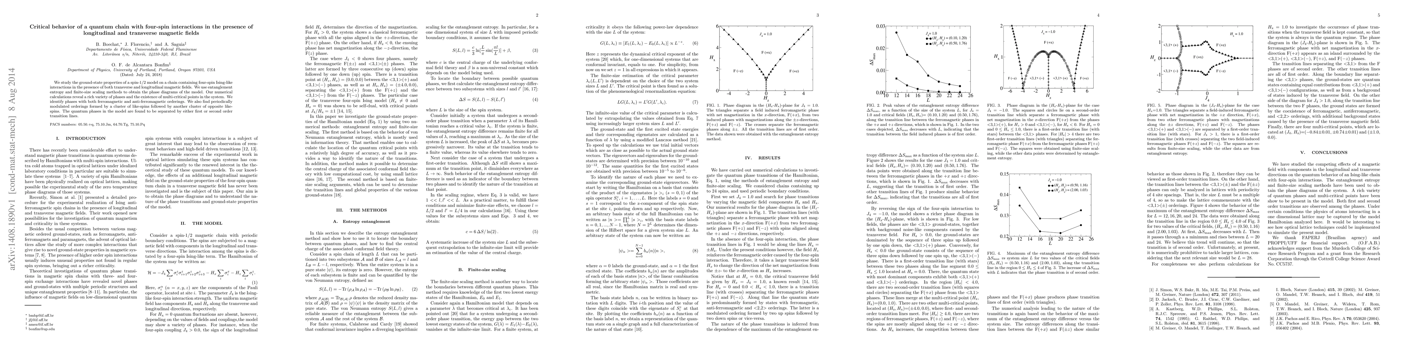 We study the ground-state properties of a spin-1/2 model on a chain containing four-spin Ising-like interactions in the presence of both transverse and longitudinal magnetic fields. We use entanglement entropy and finite-size scaling methods to obtain the phase diagrams of the model. Our numerical calculations reveal a rich variety of phases and the existence of multi-critical points in the system. We identify phases with both ferromagnetic and anti-ferromagnetic orderings. We also find periodically modulated orderings formed by a cluster of like-spins followed by another cluster of opposite like-spins. The quantum phases in the model are found to be separated by either first or second order transition lines.