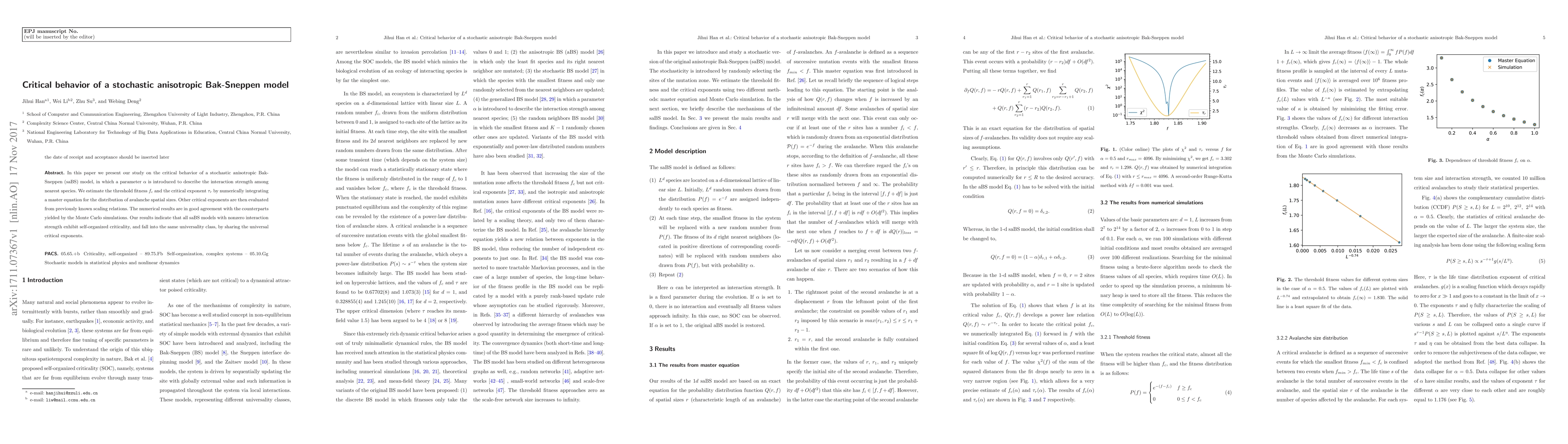 In this paper we present our study on the critical behavior of a stochastic anisotropic Bak-Sneppen (saBS) model, in which a parameter $\alpha$ is introduced to describe the interaction strength among nearest species. We estimate the threshold fitness $f_c$ and the critical exponent $\tau_r$ by numerically integrating a master equation for the distribution of avalanche spatial sizes. Other critical exponents are then evaluated from previously known scaling relations. The numerical results are in good agreement with the counterparts yielded by the Monte Carlo simulations. Our results indicate that all saBS models with nonzero interaction strength exhibit self-organized criticality, and fall into the same universality class, by sharing the universal critical exponents.