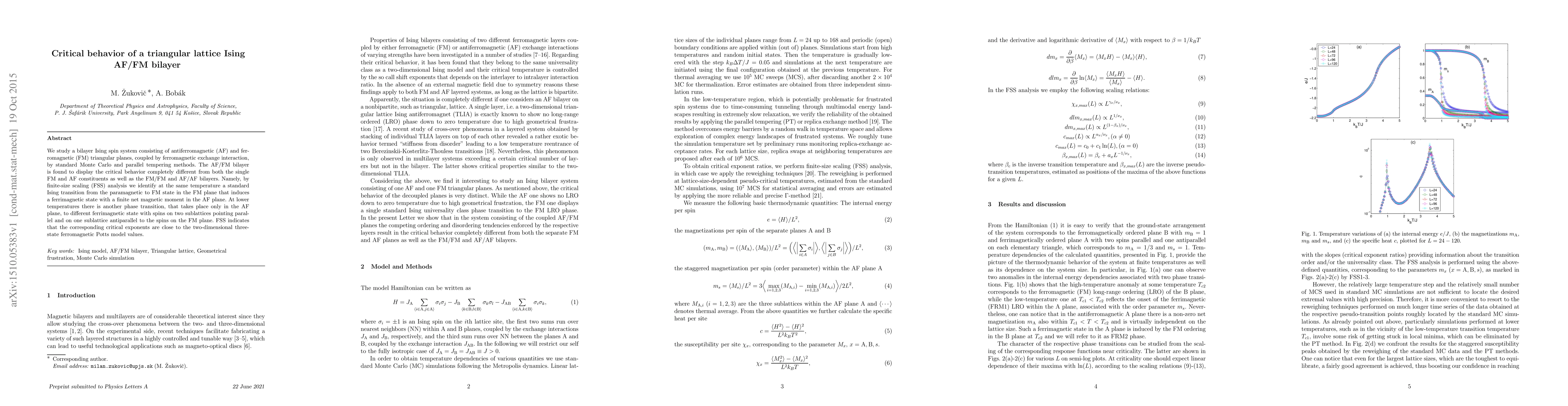 This study investigates the critical behavior of a bilayer Ising spin system with antiferromagnetic and ferromagnetic triangular planes coupled by ferromagnetic exchange. The system exhibits unique critical behavior, including a transition from paramagnetic to ferromagnetic in the FM plane and a ferrimagnetic state in the AF plane, followed by a distinct phase transition in the AF plane characterized by parallel and antiparallel spin alignments. The critical exponents are found to align with those of the two-dimensional three-state ferromagnetic Potts model.