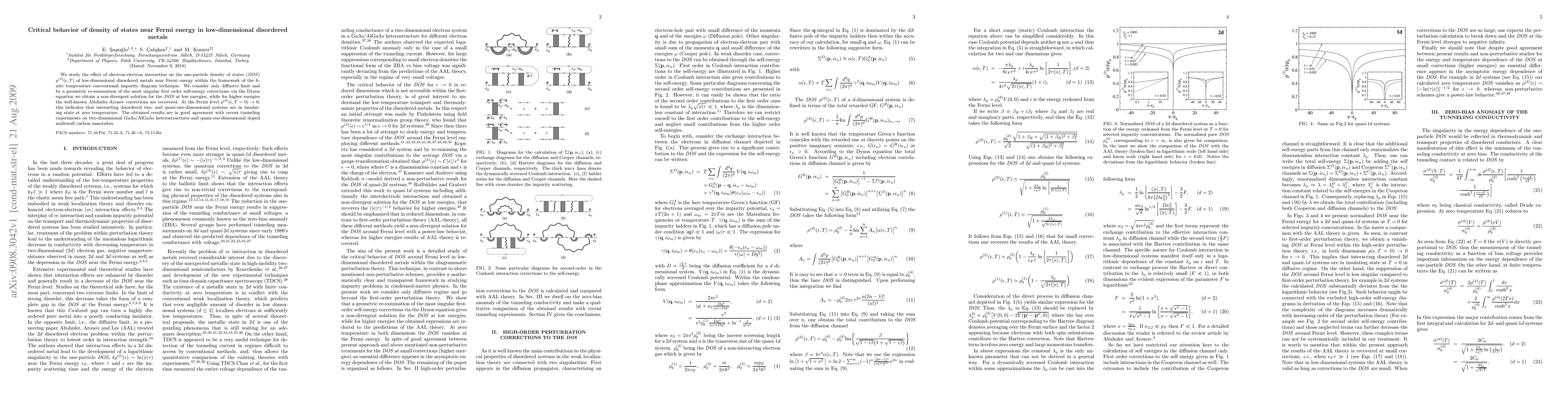 This paper explores electron-electron interactions' impact on the density of states in low-dimensional disordered metals near the Fermi energy using the finite temperature impurity diagram technique. It reveals a non-divergent density of states at low energies, indicating insulating behavior at zero temperature, corroborated by recent experimental findings on GaAs/AlGaAs and carbon nanotubes.