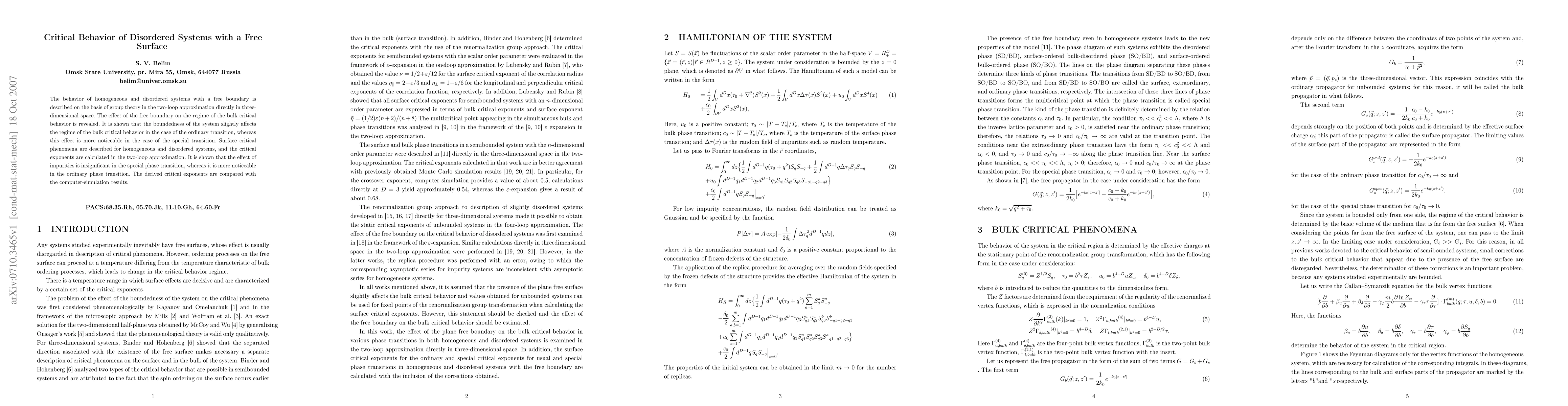 The behavior of homogeneous and disordered systems with a free boundary is described on the basis of group theory in the two-loop approximation directly in three-dimensional space. The effect of the free boundary on the regime of the bulk critical behavior is revealed. It is shown that the boundedness of the system slightly affects the regime of the bulk critical behavior in the case of the ordinary transition, whereas this effect is more noticeable in the case of the special transition. Surface critical phenomena are described for homogeneous and disordered systems, and the critical exponents are calculated in the two-loop approximation. It is shown that the effect of impurities is insignificant in the special phase transition, whereas it is more noticeable in the ordinary phase transition. The derived critical exponents are compared with the computer-simulation results.