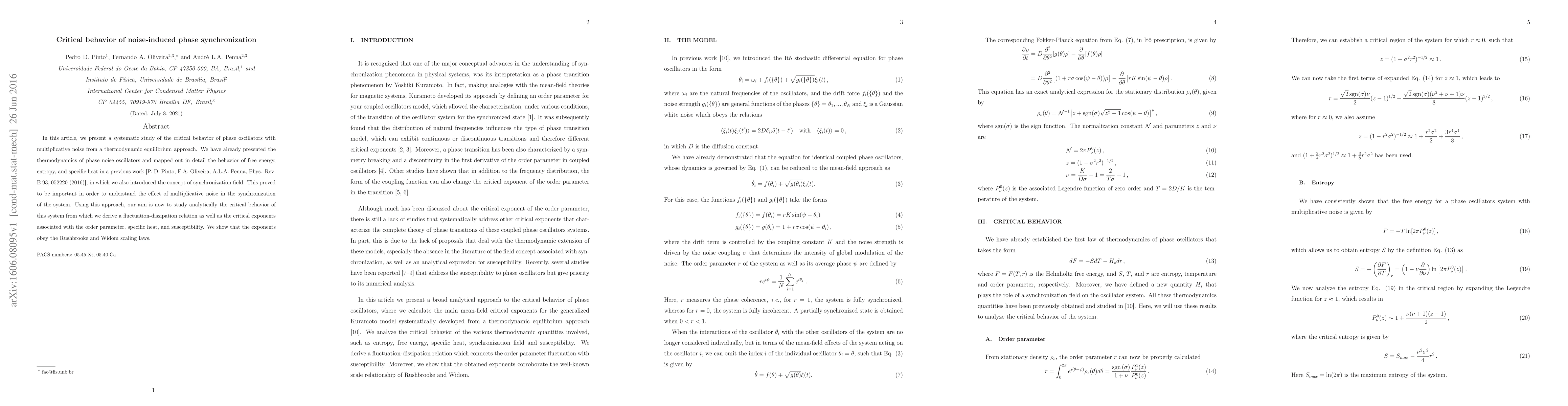 This paper systematically investigates the critical behavior of phase oscillators under multiplicative noise, employing a thermodynamic equilibrium framework. The study derives critical exponents and a fluctuation-dissipation relation, demonstrating adherence to Rushbrooke and Widom scaling laws.
