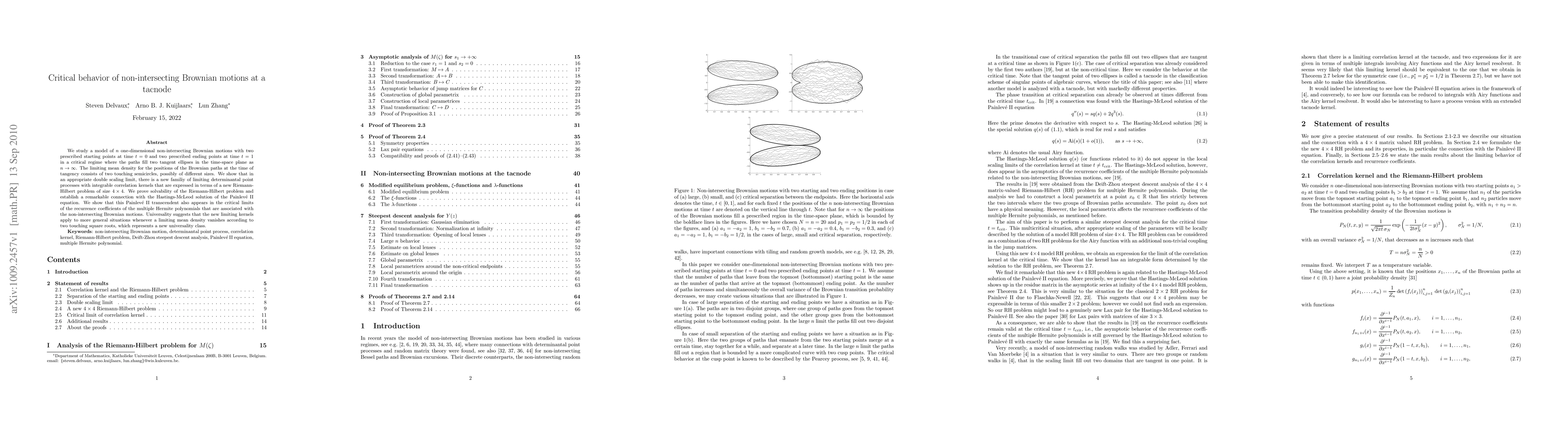 We study a model of $n$ one-dimensional non-intersecting Brownian motions with two prescribed starting points at time $t=0$ and two prescribed ending points at time $t=1$ in a critical regime where the paths fill two tangent ellipses in the time-space plane as $n \to \infty$. The limiting mean density for the positions of the Brownian paths at the time of tangency consists of two touching semicircles, possibly of different sizes. We show that in an appropriate double scaling limit, there is a new familiy of limiting determinantal point processes with integrable correlation kernels that are expressed in terms of a new Riemann-Hilbert problem of size $4\times 4$. We prove solvability of the Riemann-Hilbert problem and establish a remarkable connection with the Hastings-McLeod solution of the Painlev\'e II equation. We show that this Painlev\'e II transcendent also appears in the critical limits of the recurrence coefficients of the multiple Hermite polynomials that are associated with the non-intersecting Brownian motions. Universality suggests that the new limiting kernels apply to more general situations whenever a limiting mean density vanishes according to two touching square roots, which represents a new universality class.