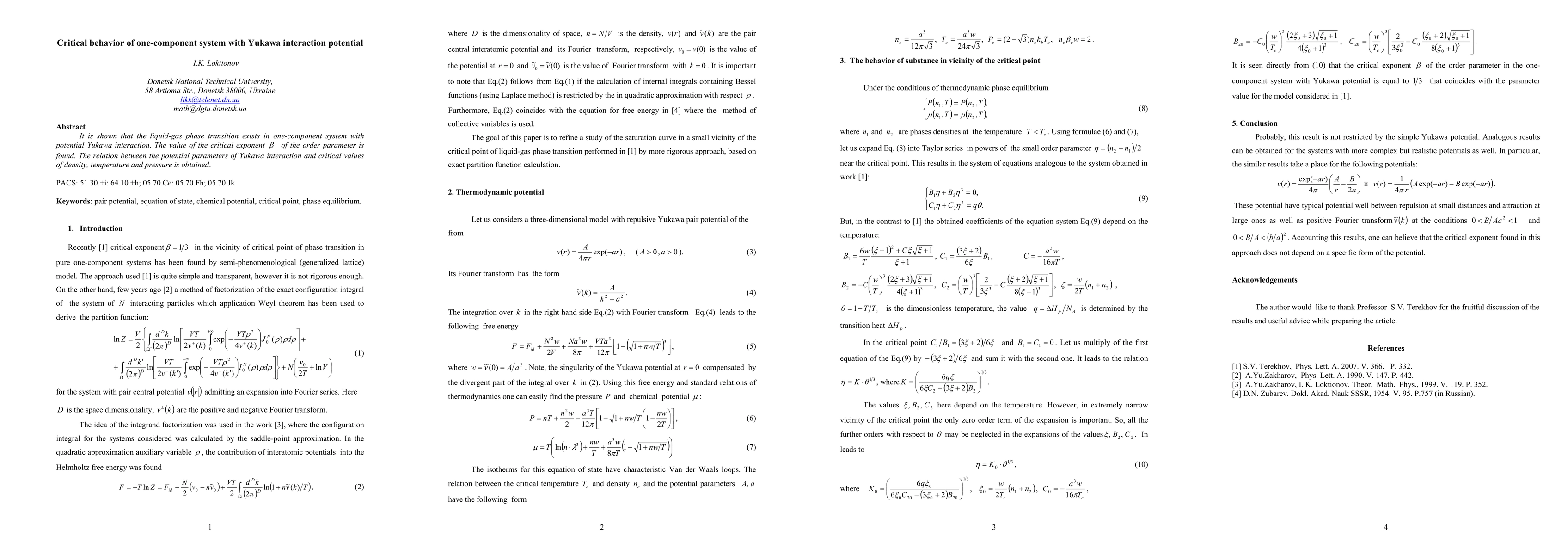 It is shown that the liquid-gas phase transition exists in one-component system with potential Yukawa interaction. The value of the critical exponent $\beta$ of the order parameter is found. The relation between the potential parameters of Yukawa interaction and critical values of density, temperature and pressure is obtained. PACS: 51.30.+i: 64.10.+h; 05.70.Ce: 05.70.Fh; 05.70.Jk