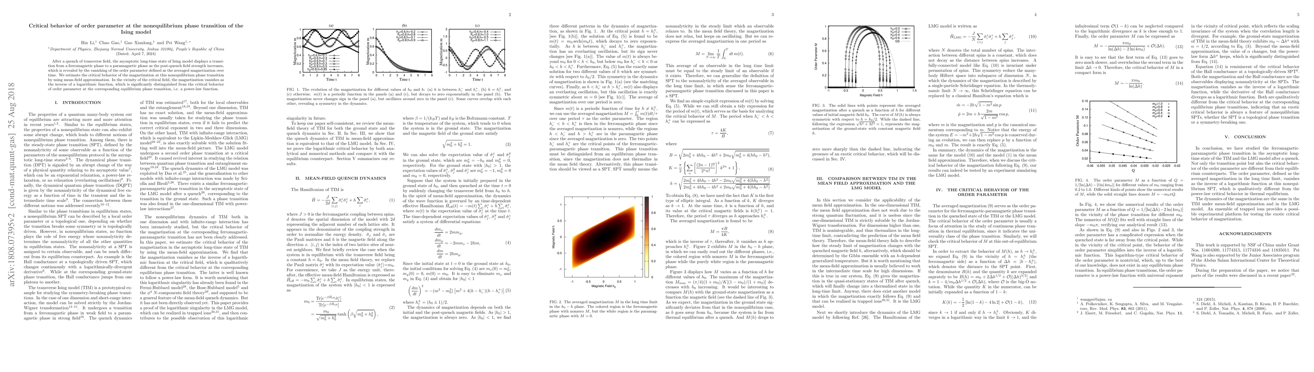 The study employs mean-field approximation to analyze the critical behavior of the order parameter in the nonequilibrium phase transition of the Ising model following a quench of transverse field. It compares the results with the equilibrium counterpart and the LMG model.