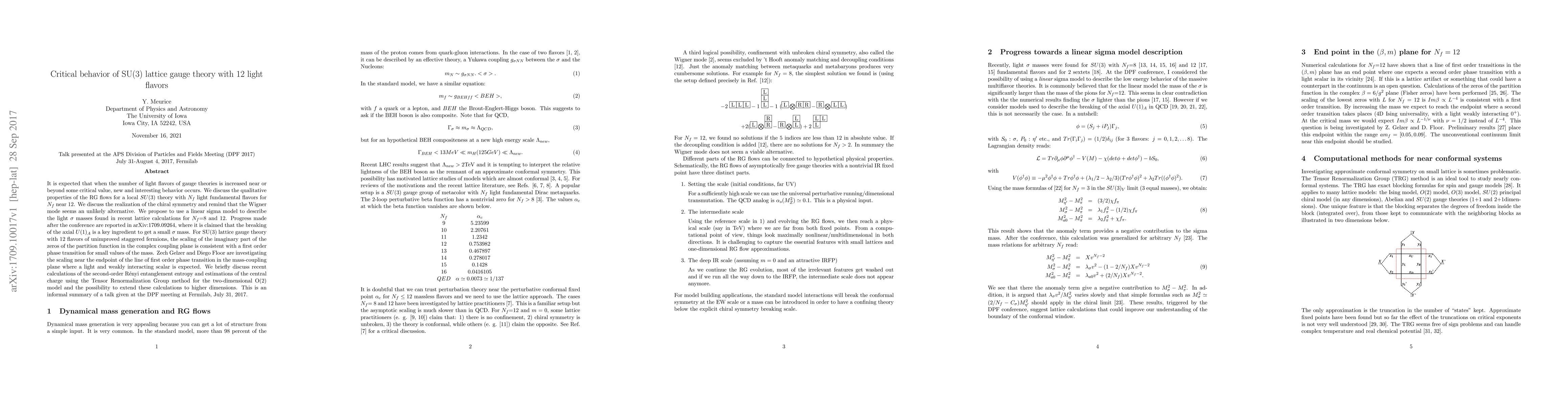 This paper explores the critical behavior of SU(3) lattice gauge theory with 12 light flavors, focusing on the qualitative properties of the renormalization group flows near the critical flavor number. It suggests the use of a linear sigma model to describe the light σ masses and discusses the breaking of axial $U(1)_A$ as crucial for obtaining small σ masses.
