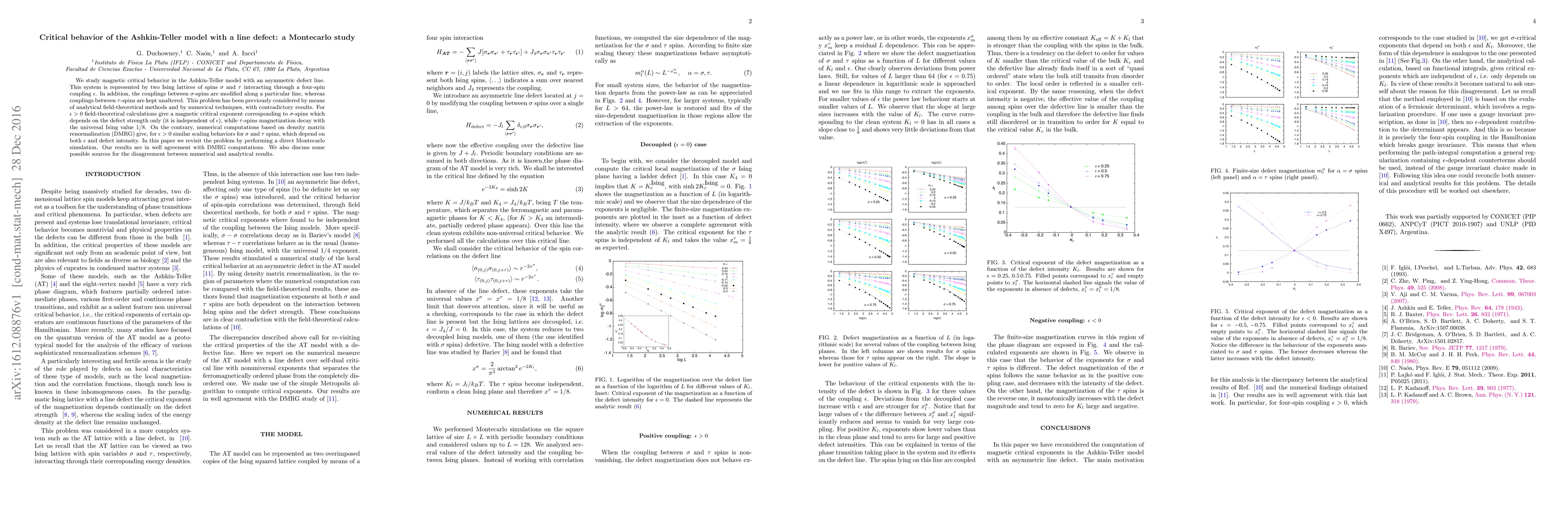 We study magnetic critical behavior in the Ashkin-Teller model with an asymmetric defect line. This system is represented by two Ising lattices of spins $\sigma$ and $\tau$ interacting through a four-spin coupling $\epsilon$. In addition, the couplings between $\sigma$-spins are modified along a particular line, whereas couplings between $\tau$-spins are kept unaltered. This problem has been previously considered by means of analytical field-theoretical methods and by numerical techniques, with contradictory results. For $\epsilon > 0$ field-theoretical calculations give a magnetic critical exponent corresponding to $\sigma$-spins which depends on the defect strength only (it is independent of $\epsilon$), while $\tau$-spins magnetization decay with the universal Ising value $1/8$. On the contrary, numerical computations based on density matrix renormalization (DMRG) give, for $\epsilon > 0$ similar scaling behaviors for $\sigma$ and $\tau$ spins, which depend on both $\epsilon$ and defect intensity. In this paper we revisit the problem by performing a direct Montecarlo simulation. Our results are in well agreement with DMRG computations. We also discuss some possible sources for the disagreement between numerical and analytical results.