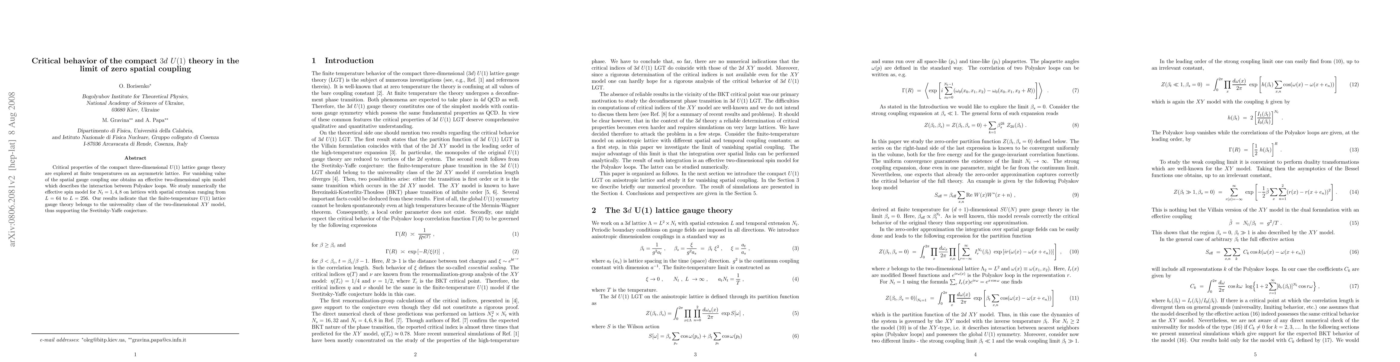 This paper investigates the critical behavior of the compact 3d U(1) lattice gauge theory at zero spatial coupling, revealing it behaves like the 2D XY model. Numerical simulations on asymmetric lattices support the Svetitsky-Yaffe conjecture for the finite-temperature U(1) lattice gauge theory.