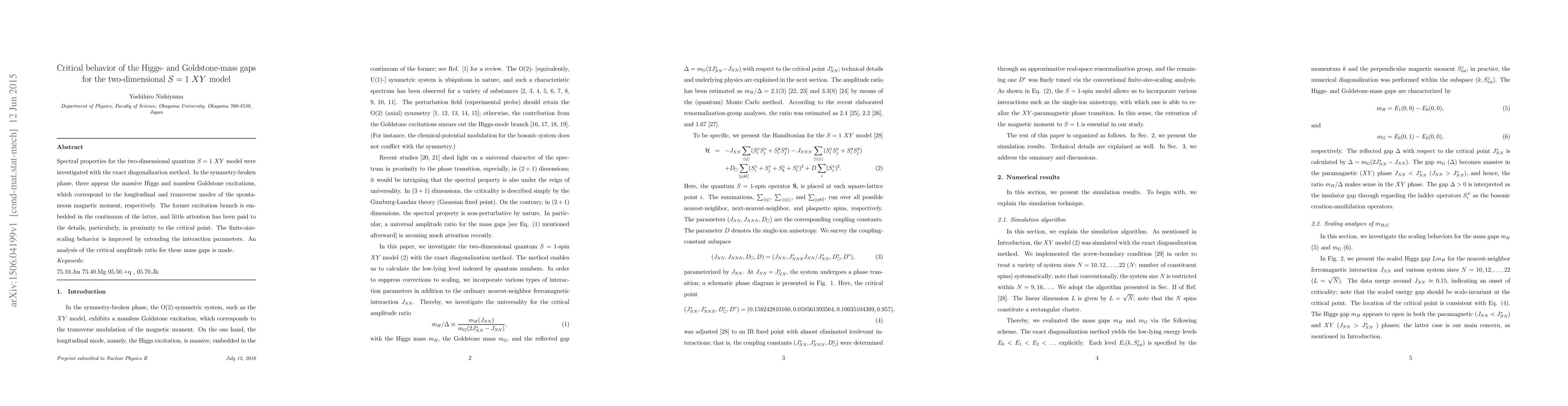 This research uses exact diagonalization to study the spectral properties of the 2D quantum S=1 XY model, revealing details about Higgs and Goldstone excitations near the critical point. The study improves finite-size-scaling behavior and analyzes the critical amplitude ratio for these mass gaps.