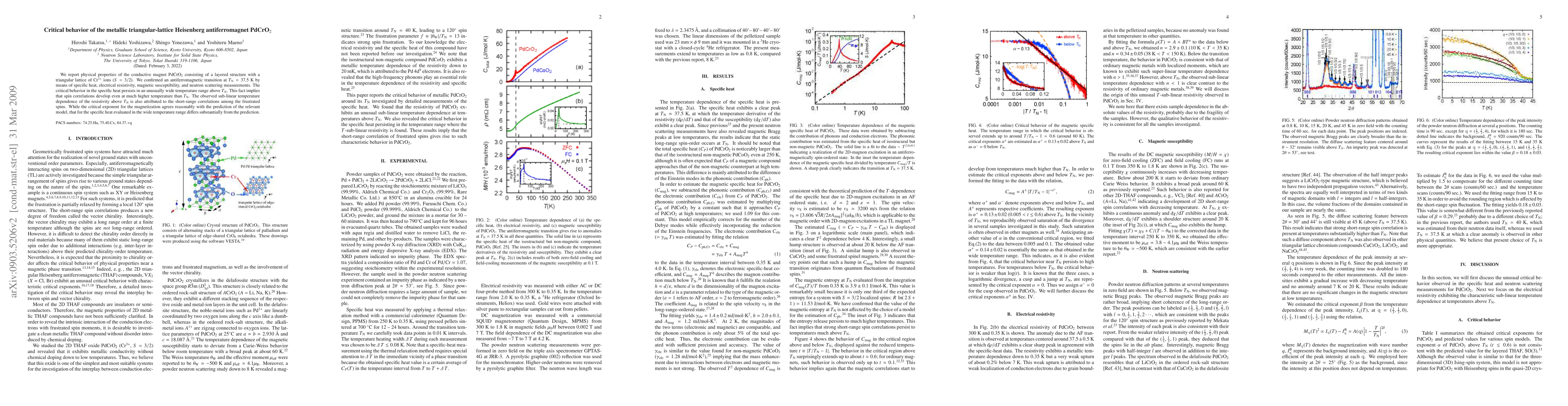 This paper investigates the physical properties of PdCrO2, a metallic triangular-lattice Heisenberg antiferromagnet, revealing an antiferromagnetic transition at 37.5K. The study finds unusual critical behavior in the specific heat extending well above the transition temperature, indicating significant spin correlations.