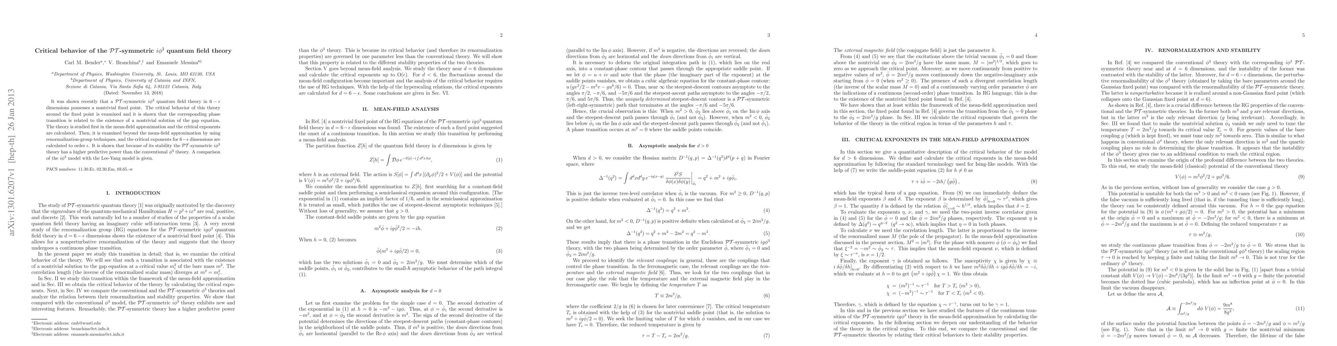 This paper investigates the critical behavior of PT-symmetric $i\phi^3$ quantum field theory, revealing a nontrivial fixed point and calculating critical exponents both in mean-field approximation and beyond using renormalization-group techniques. The study finds that the PT-symmetric theory offers higher predictive power compared to conventional $\phi^3$ theory.