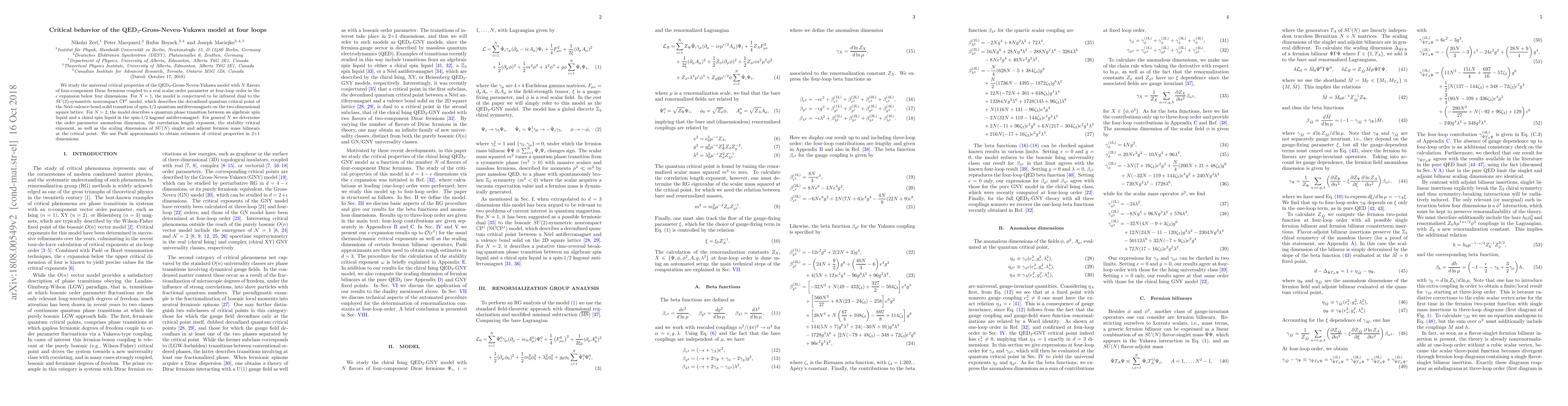 This paper investigates the critical behavior of the QED$_3$-Gross-Neveu-Yukawa model at four loops, determining key exponents and scaling dimensions for $N$ flavors, and conjectures its infrared duality to the $\mathbb{C}$P$^1$ model, relevant for quantum critical phenomena in spin systems.