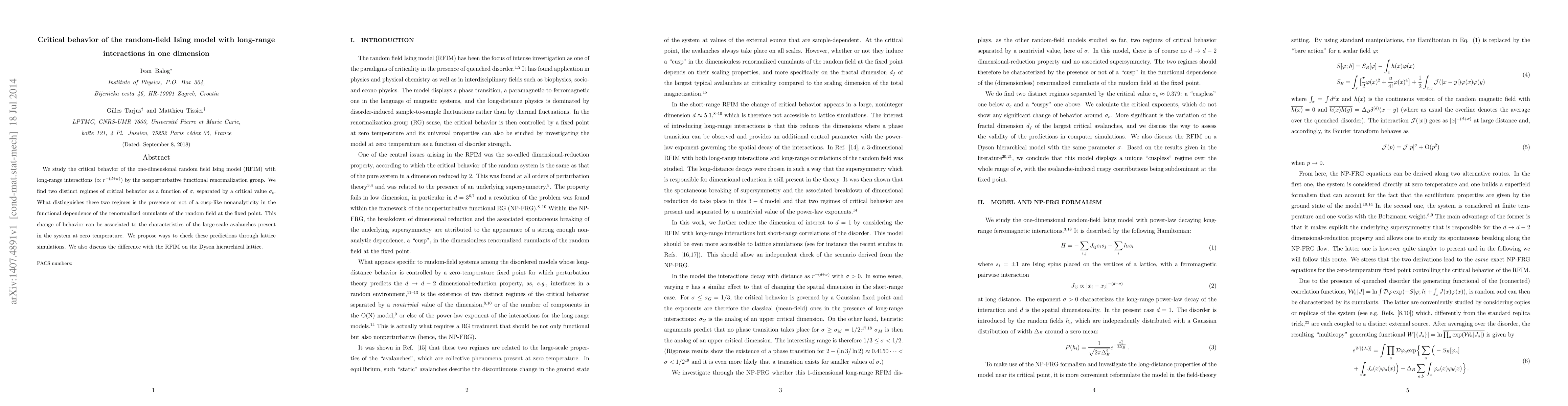 This paper investigates the critical behavior of a one-dimensional random-field Ising model with long-range interactions using nonperturbative functional renormalization group methods. It identifies two distinct critical regimes separated by a critical value $\sigma_c$, characterized by the presence or absence of cusp-like nonanalyticity in renormalized cumulants.