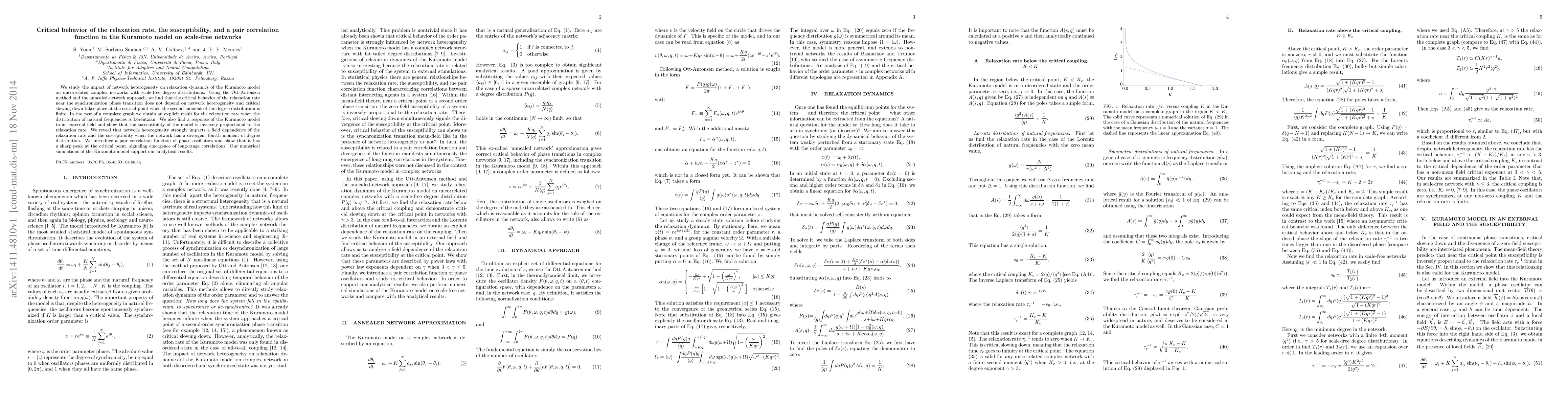 We study the impact of network heterogeneity on relaxation dynamics of the Kuramoto model on uncorrelated complex networks with scale-free degree distributions. Using the Ott-Antonsen method and the annealed-network approach, we find that the critical behavior of the relaxation rate near the synchronization phase transition does not depend on network heterogeneity and critical slowing down takes place at the critical point when the second moment of the degree distribution is finite. In the case of a complete graph we obtain an explicit result for the relaxation rate when the distribution of natural frequencies is Lorentzian. We also find a response of the Kuramoto model to an external field and show that the susceptibility of the model is inversely proportional to the relaxation rate. We reveal that network heterogeneity strongly impacts a field dependence of the relaxation rate and the susceptibility when the network has a divergent fourth moment of degree distribution. We introduce a pair correlation function of phase oscillators and show that it has a sharp peak at the critical point, signaling emergence of long-range correlations. Our numerical simulations of the Kuramoto model support our analytical results.